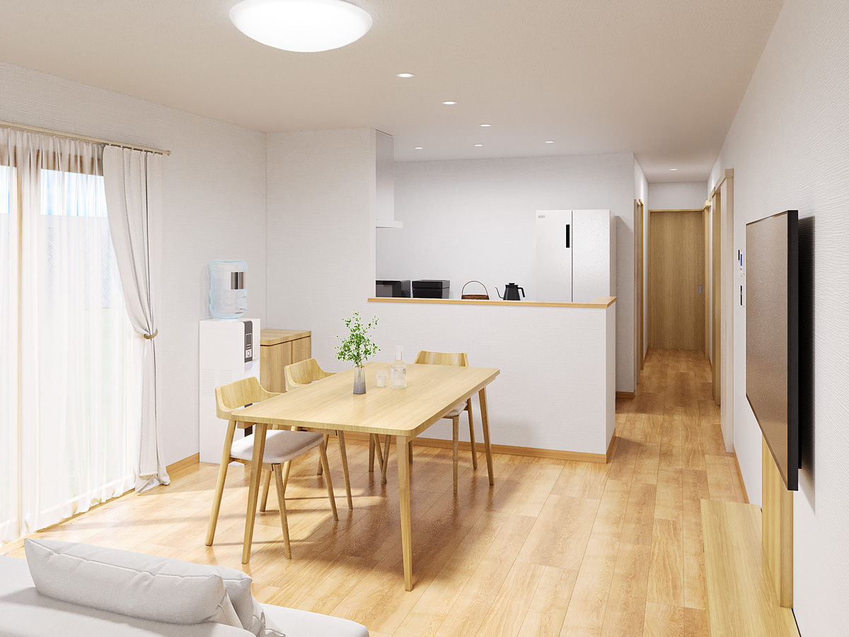 やわらかな光が差し込むリビングは、ダイニング・キッチンとゆるやかにつながる開放感ある空間。