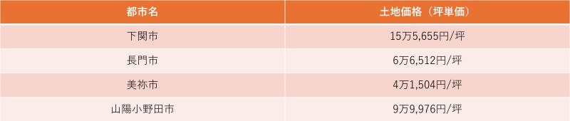 下関市は県内でも人口が最も多く市街地が広がっているため、 土地価格が比較的高い傾向にあります。