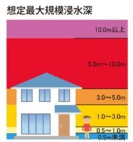 赤色で示された区域は想定最大規模浸水深が5.0m以上となり、家屋への被害が甚大になる恐れがあるため、土地選びの際は慎重な確認が必要です。