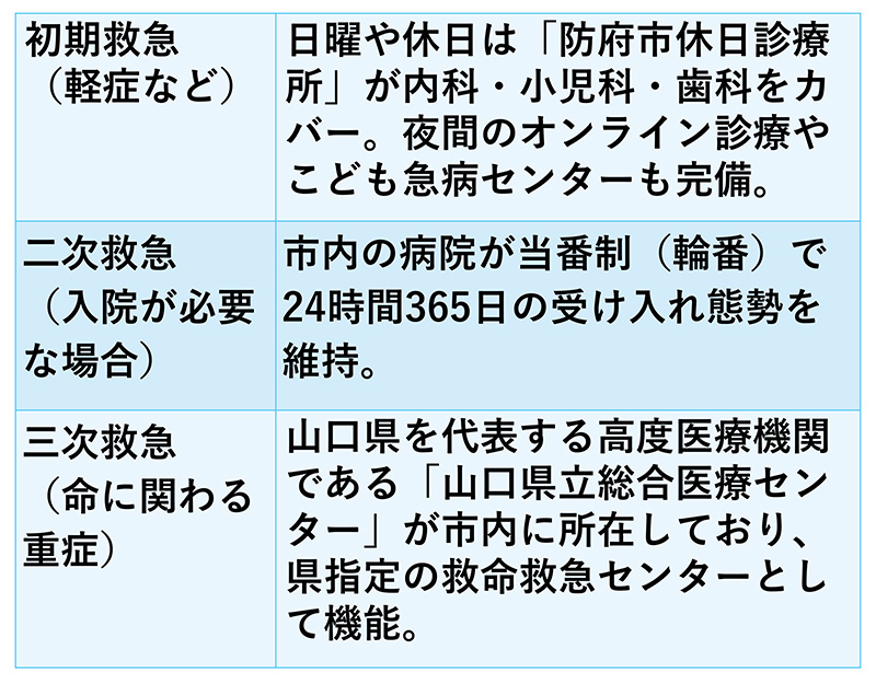 防府市では、医師会や地域の医療機関が連携し、病状の緊急度に応じた手厚い救急体制を整えています。
