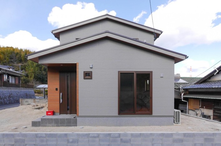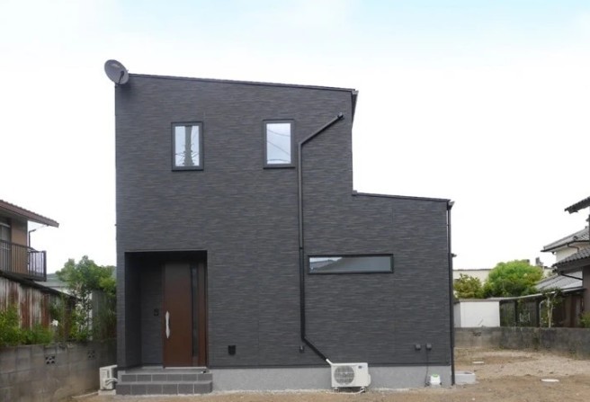 柳井市のK様邸は、落ち着いた色合いと直線的なフォルムが美しい、街並みに調和するスタイリッシュな外観が印象的なお住まいです。