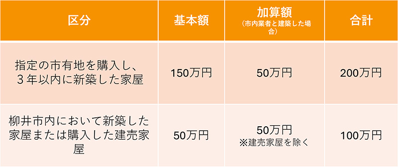 もっとも手厚い補助が受けられるのは、市が所有する土地(市有地)を購入して、市内業者と契約した場合で200万円受け取れます。