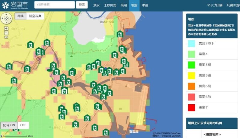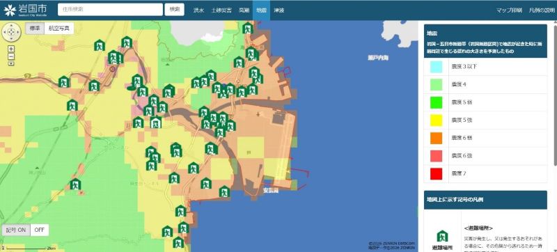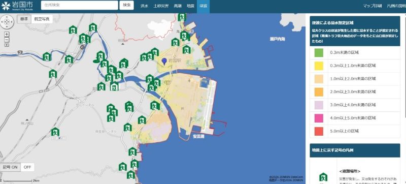 岩国市内の被災想定区域や被害の程度、避難場所、避難経路を確認できます。