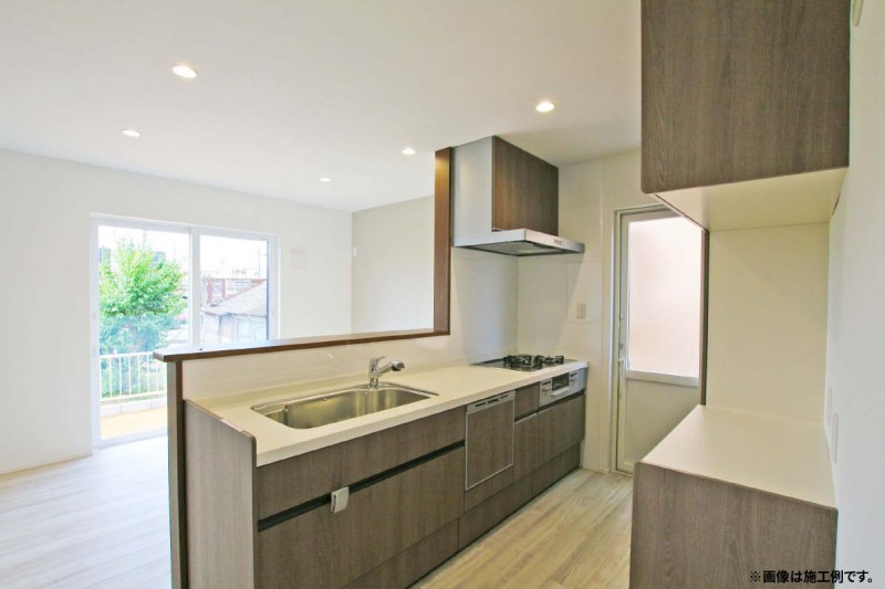 色調を合わせたキッチンは奥行もあり広く解放感あるスペースを確保しております。作り付けのカップボードも収納多く、新たに設置する必要もございません。