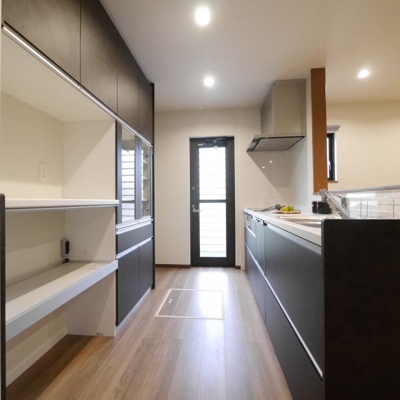 明るい自然光が入るキッチン作業スペースを多くとった対面キッチン。夫婦そろってキッチンに立っても調理がしやすく余裕の広さ。食器類もすっきりと片付く収納力。家事をしながら会話も弾みます。
