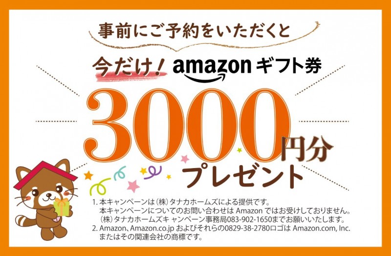 初めて、タナカホームズへご予約ご来場いただくと、おうち時間でも使えるアマゾンギフト3000円分をプレゼント!