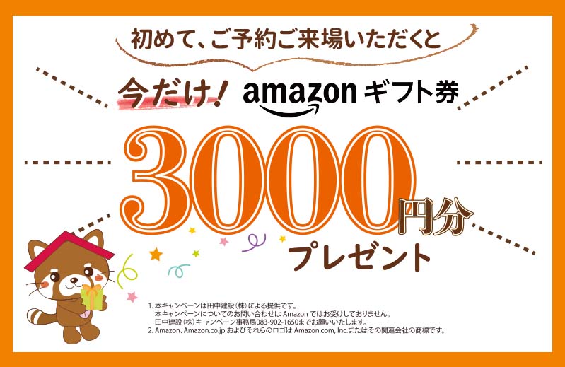 初めて、タナカホームズへご予約ご来場いただくと、おうち時間でも使えるアマゾンギフト3000円分をプレゼント!
