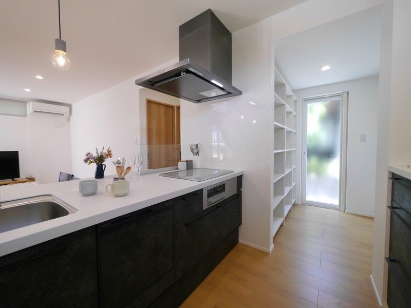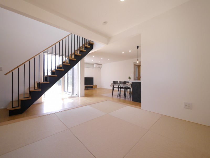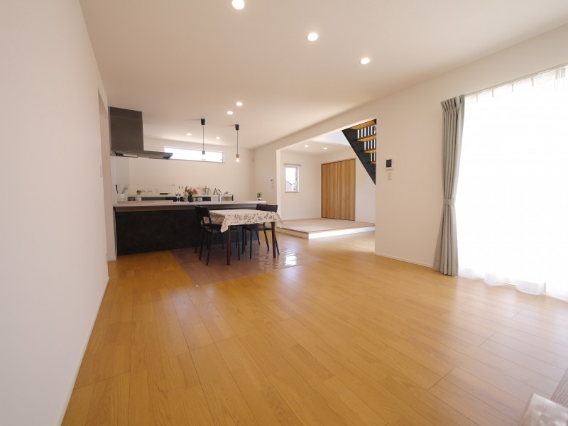 LDK16帖の続き間にある小上がり和室がおしゃれな空間と収納スペースをしっかりと確保した住宅。