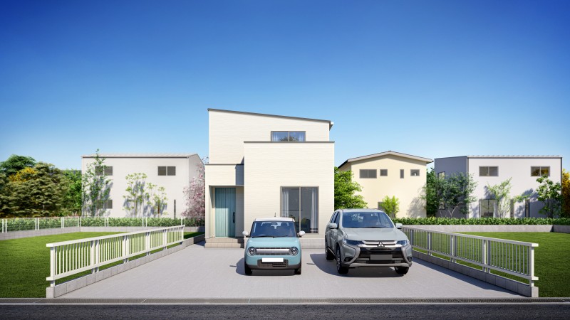 水色の玄関をアクセントにした白色外壁が映える洋風外観。