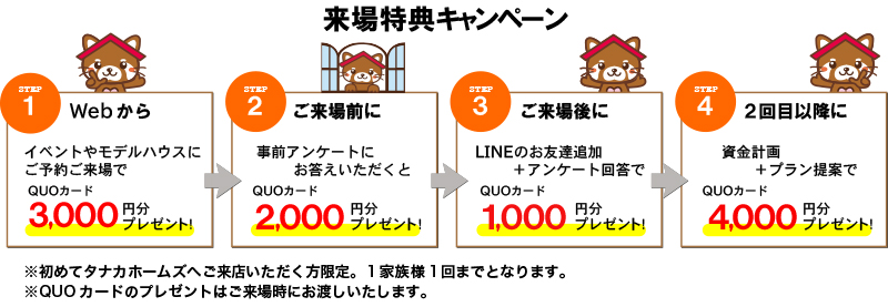 初めてタナカホームズへご予約ご来場いただくと、QUOカード最大10,000円分をプレゼント!