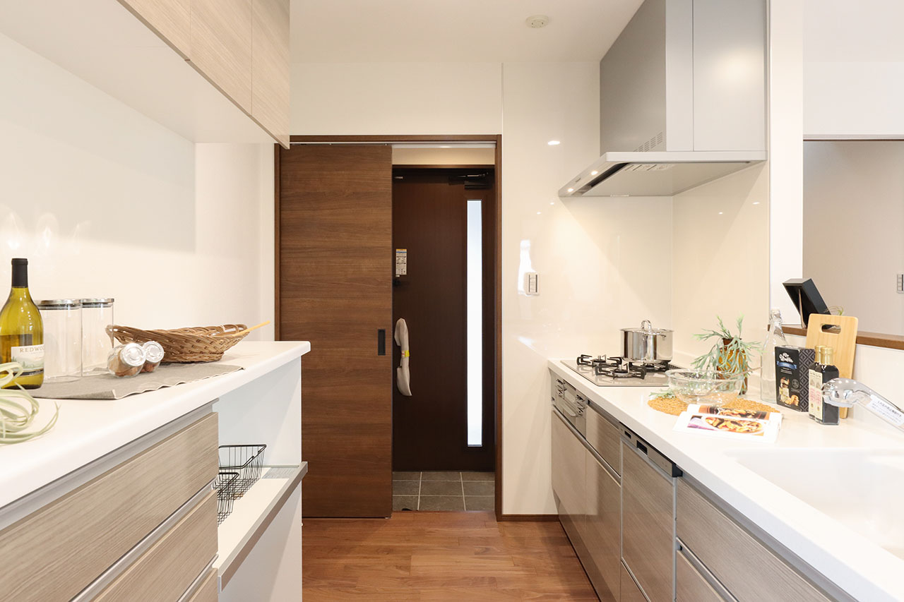 玄関からキッチンへつながる動線にしたことで、重たい荷物もラクラク運ぶことができます。
