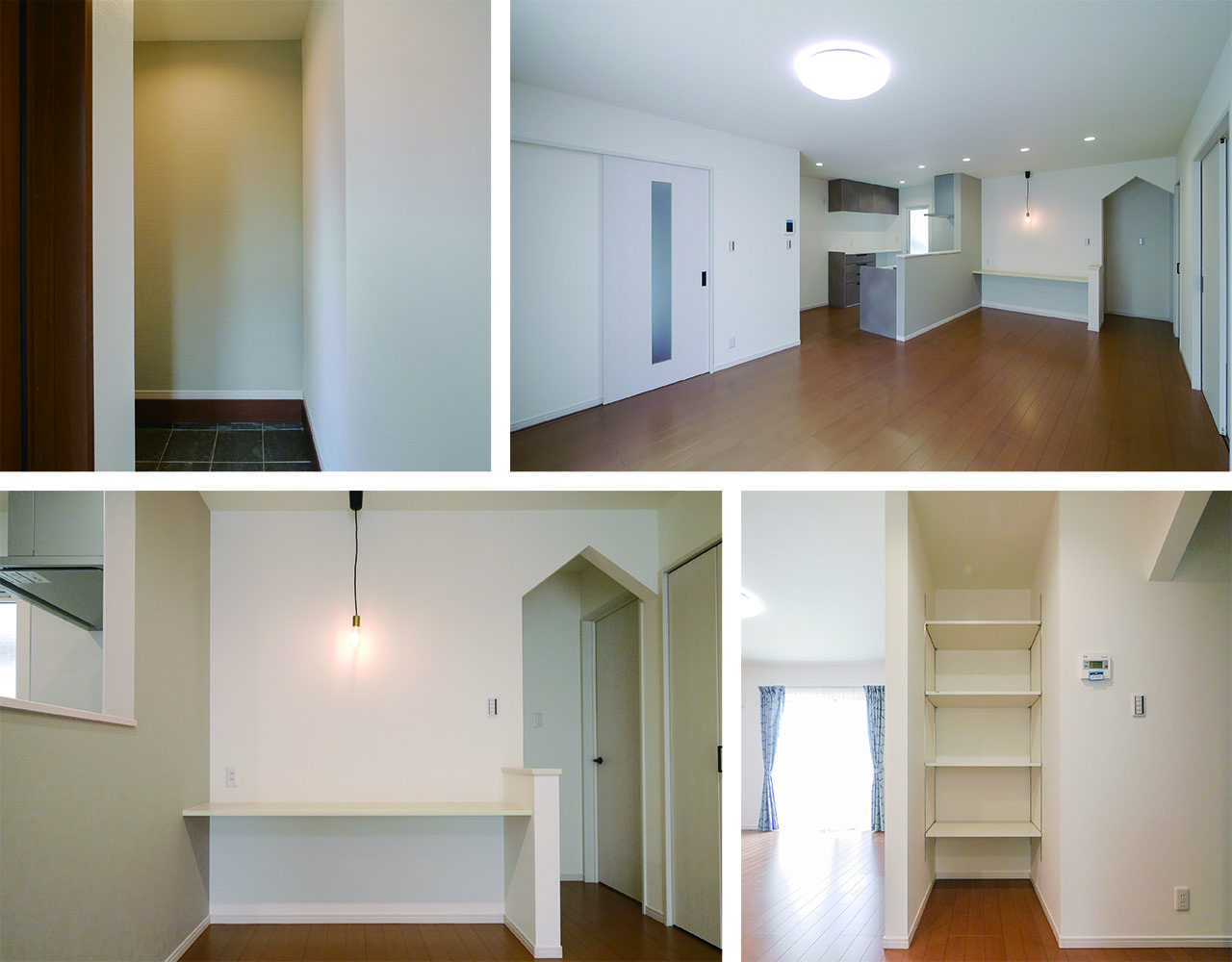 垂れ壁の近くにはスタディスペースと隠れた収納スペースもあり、お子様の宿題やお勉強もはかどりそうです♪