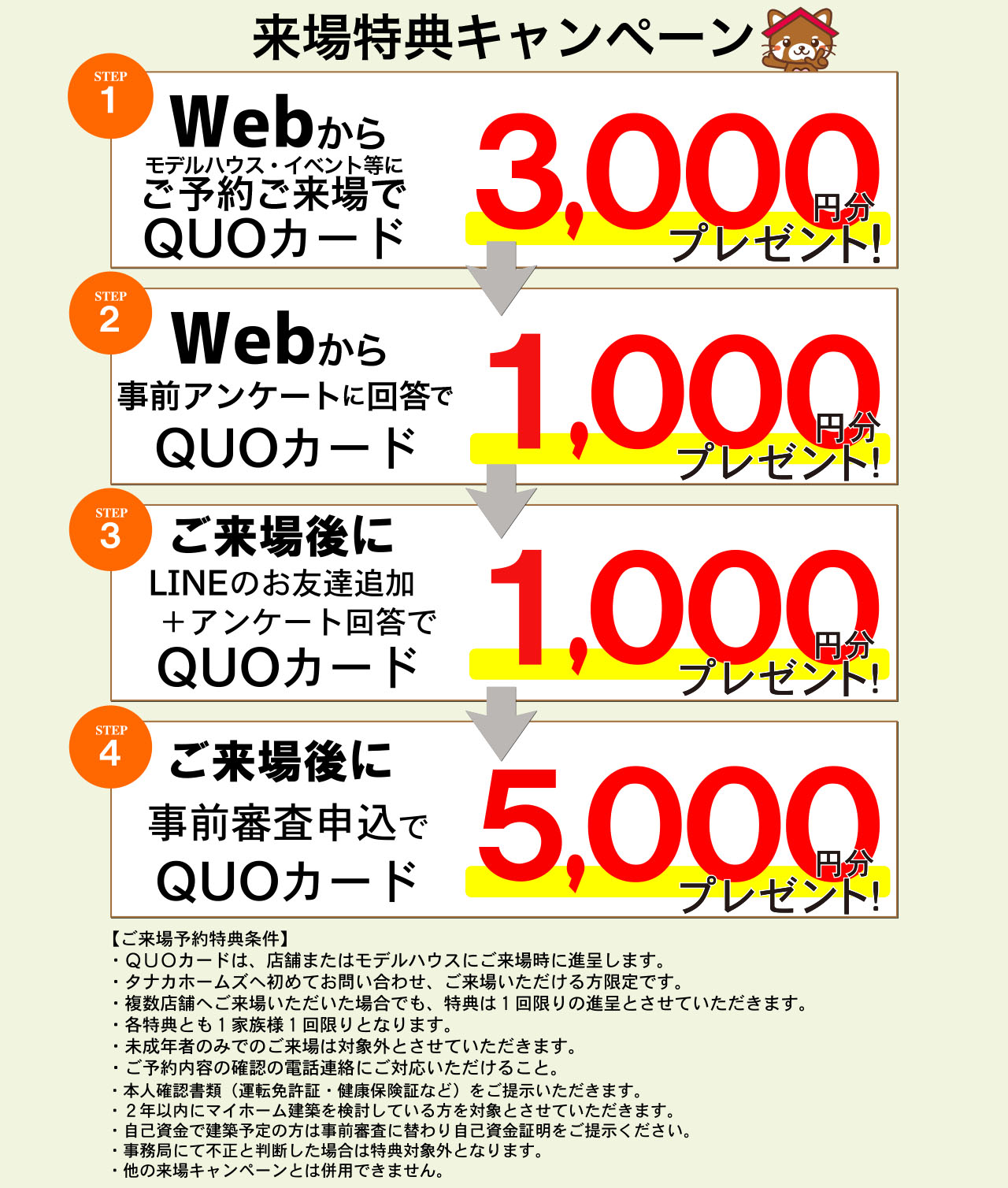 初めてタナカホームズへご予約ご来場いただくと、QUOカード最大10,000円分をプレゼント!