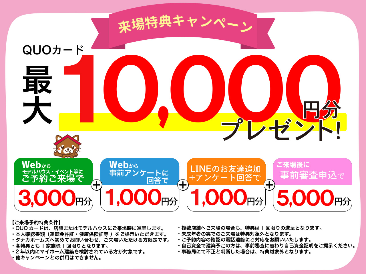 初めてタナカホームズへご予約ご来場いただくと、QUOカード最大10,000円分をプレゼント!