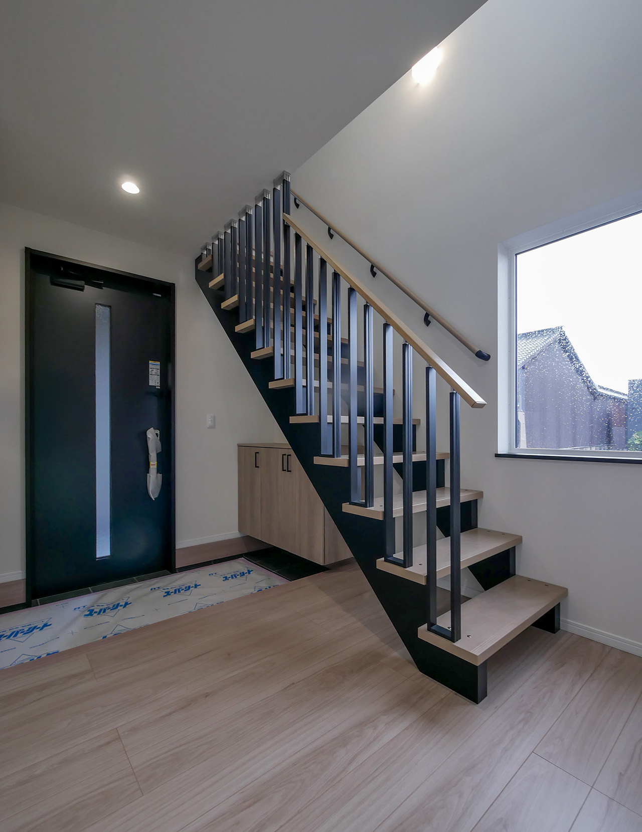 光がたっぷり差し込むデザイン階段が、家の印象をさらに引き立てる。