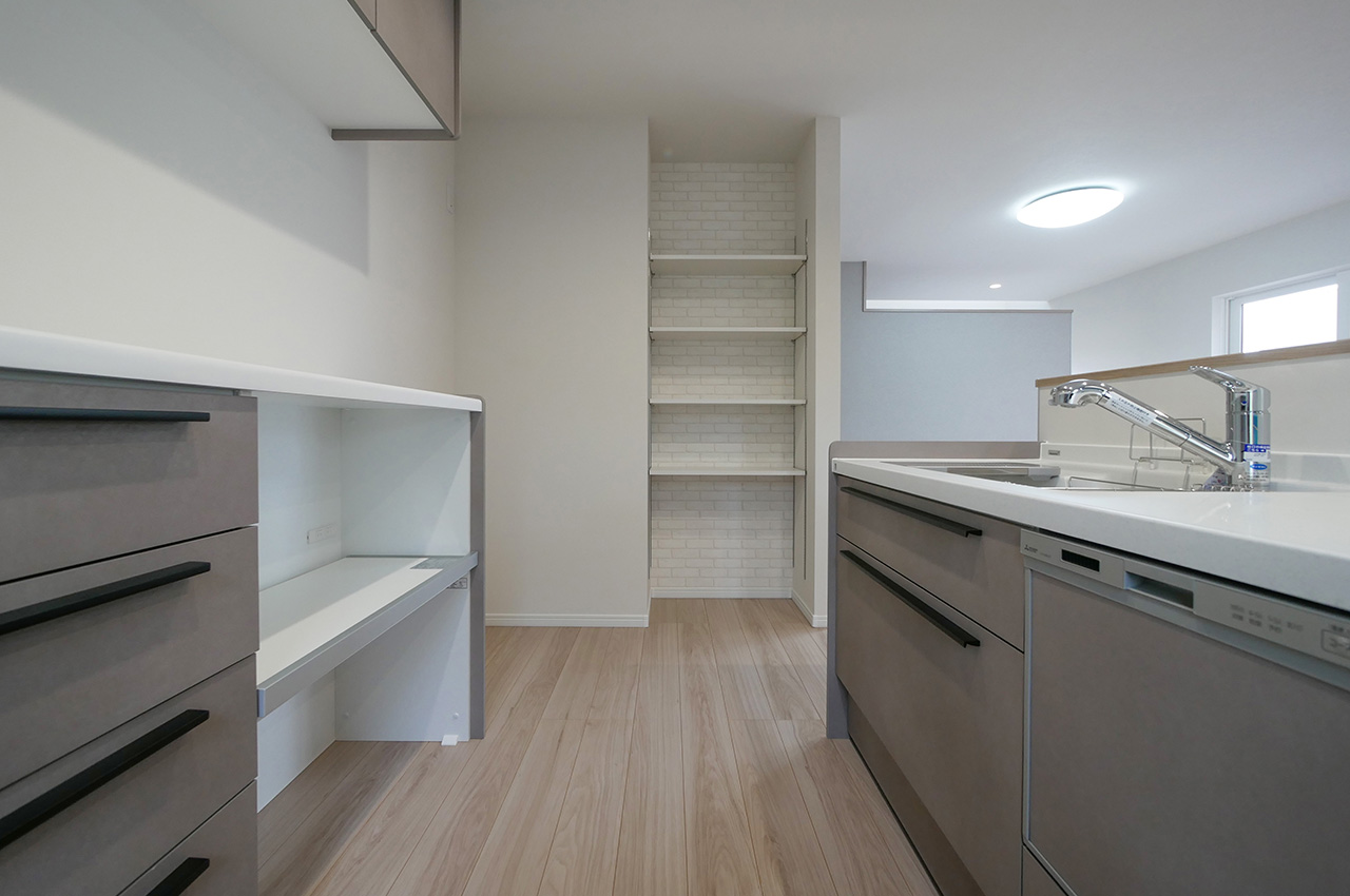 ストックや調理道具をすっきり整理できるパントリーがあれば、キッチンの作業効率もアップ。