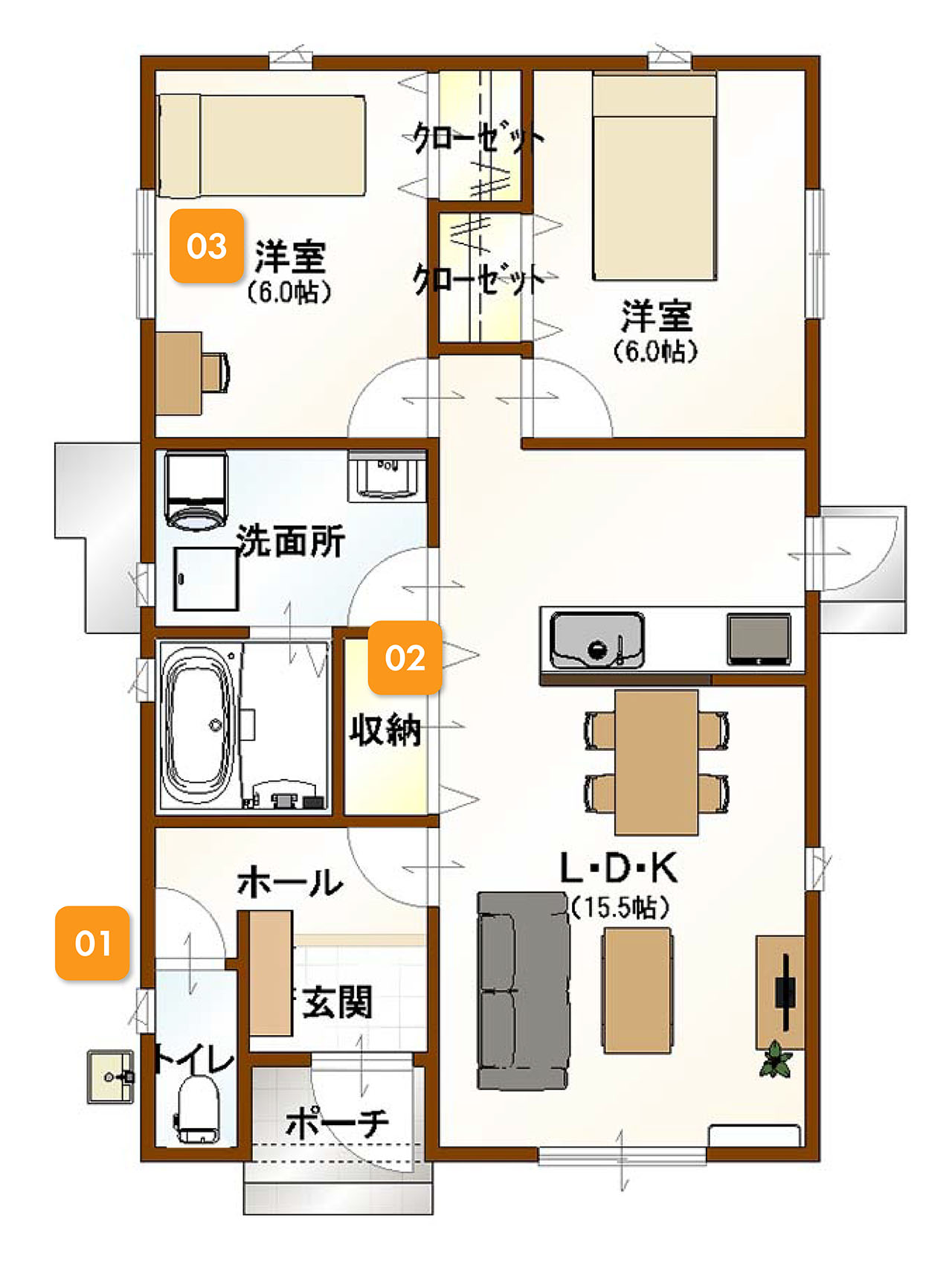 玄関すぐの場所にトイレを設けたことで、家族はもちろん来客にも使いやすい間取り。