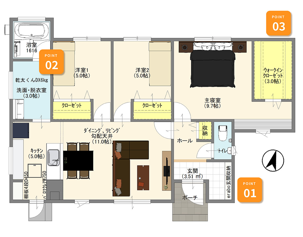 脱衣スペースにガス衣類乾燥機『乾太くん』を採用。