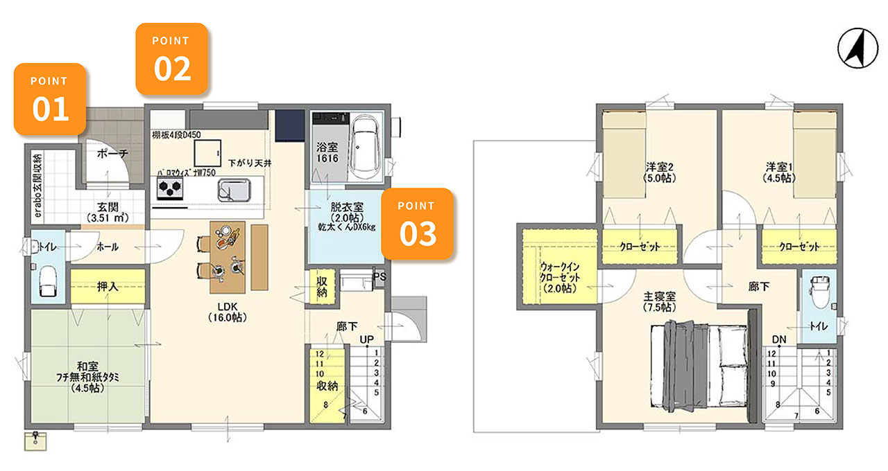 こちらは洗面化粧台を独立させて、2帖の脱衣を有効的に使えるように工夫しています。