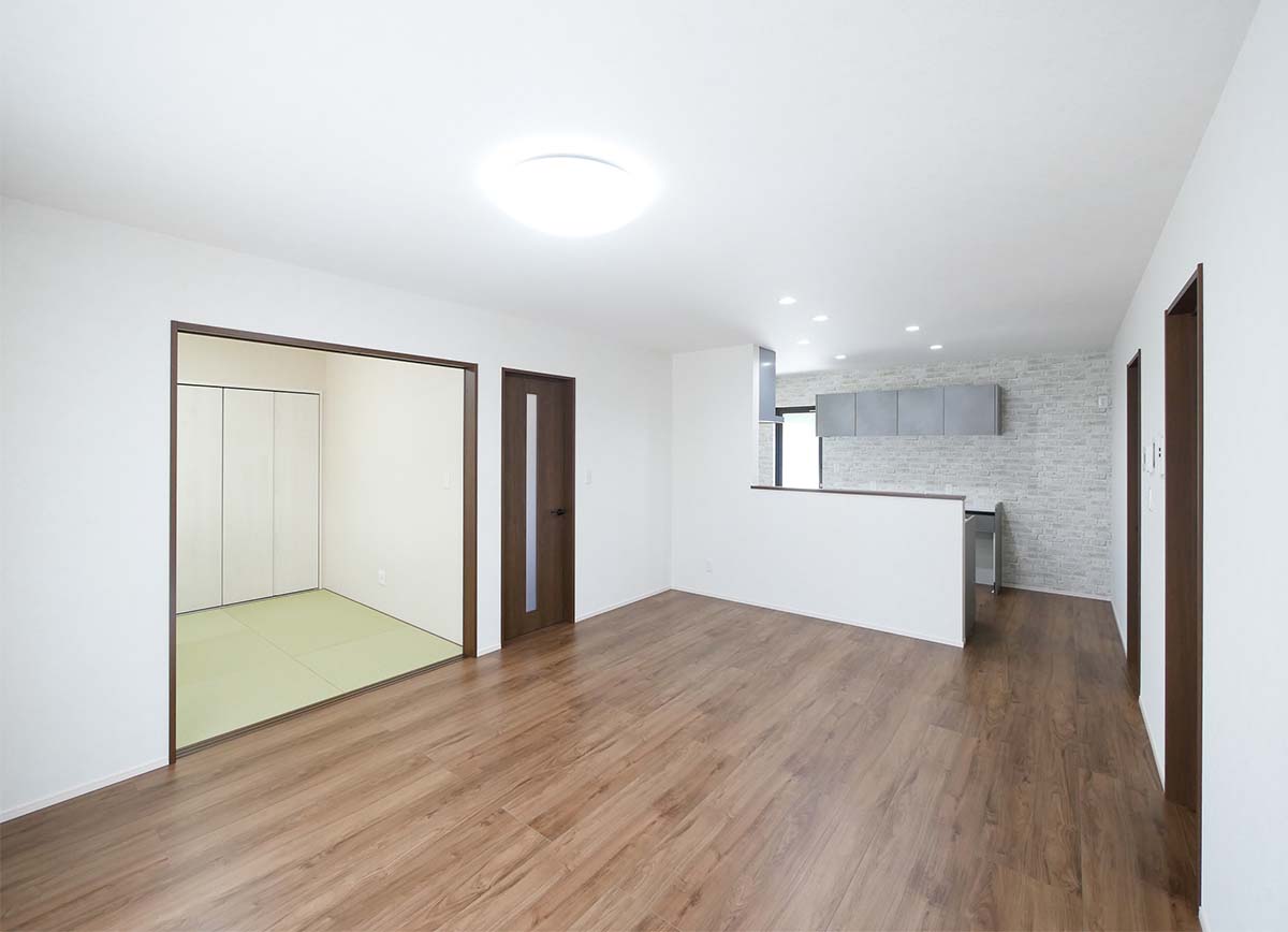 LDKに隣接して5帖の和室が配置され、続き間として一体利用が可能。