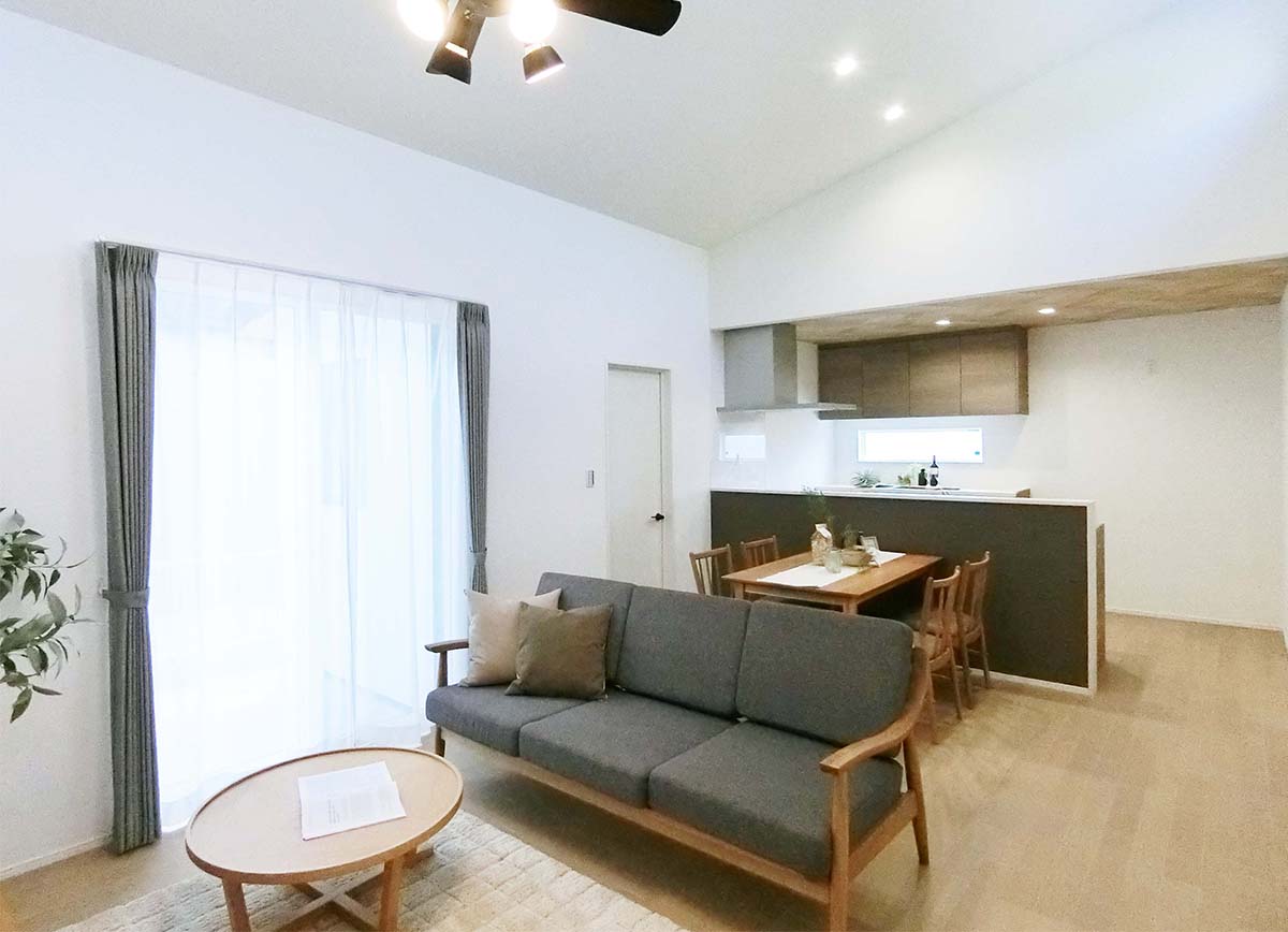開放感を感じられる勾配天井と採光に優れた高窓で、リラックスできる空間に仕上げたLDK。