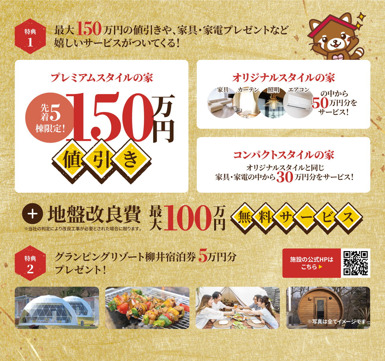 プレミアムスタイル…75万円値引き/オリジナルスタイル…家具・家電25万円分サービス/コンパクトスタイル…家具・家電10万円分サービス