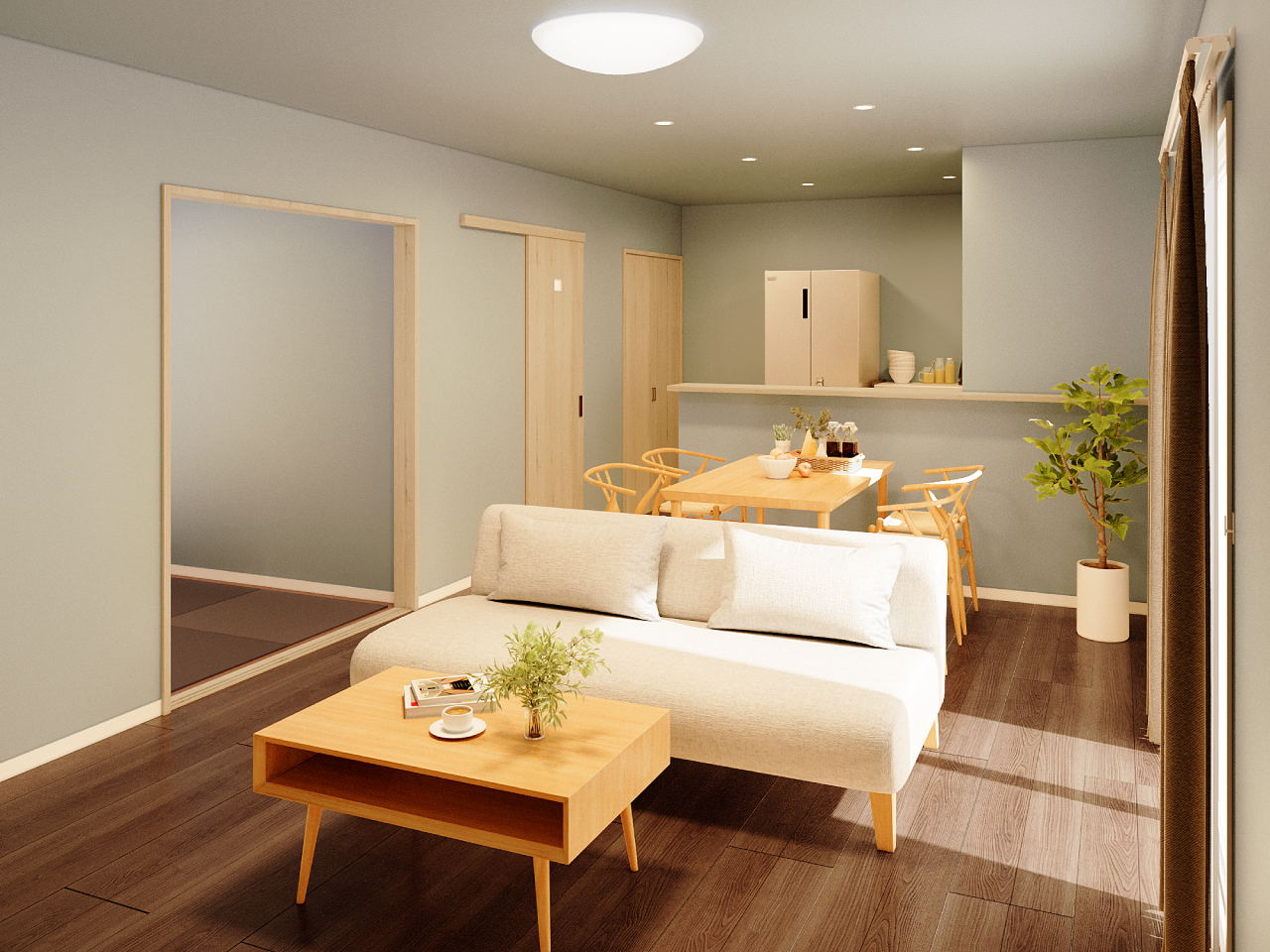 LDKに隣接した和室は、くつろぎや家事、来客対応まで幅広く使える、暮らしに寄り添う空間です。