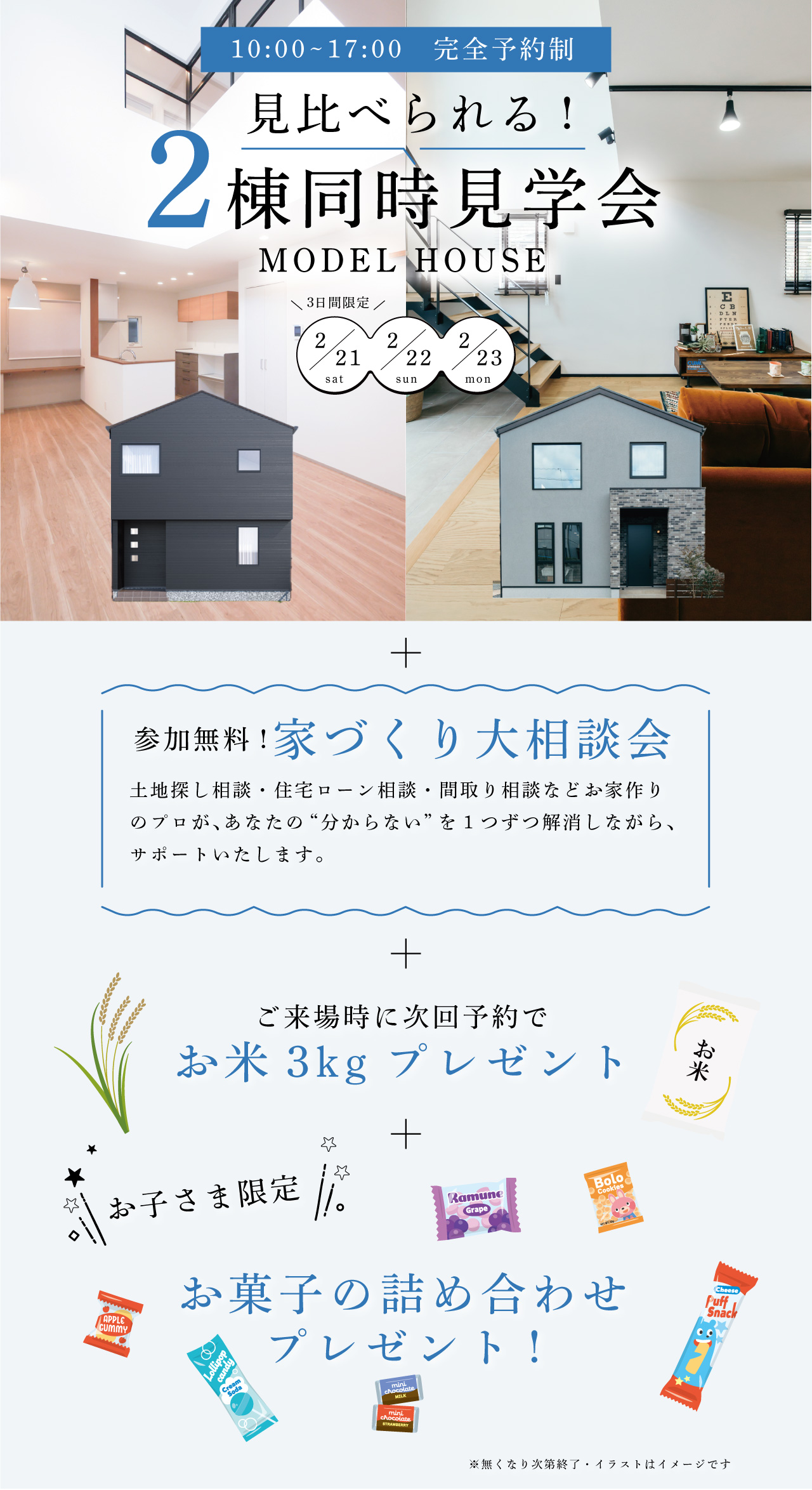 モデルハウス2棟を一気に見比べることができる見学会を開催します!