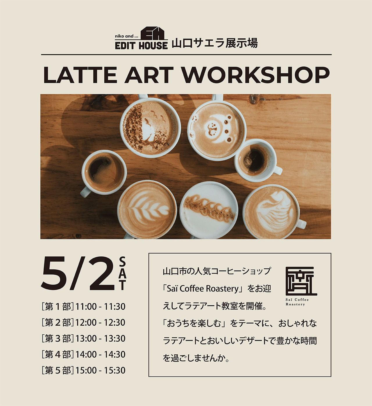 【niko and ... EDIT HOUSE 山口サエラ展示場】Saï Coffee Roastery ラテアートワークショップ in山口市