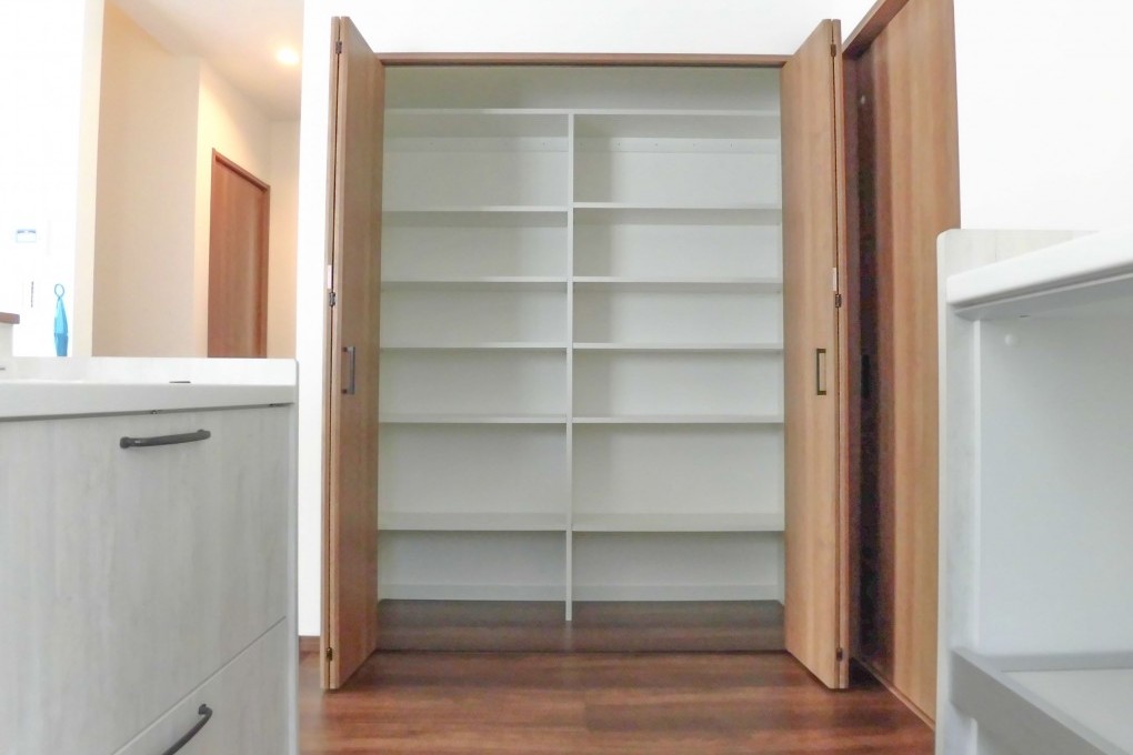 キッチン横には造作棚を一面に取り付けた収納完備!