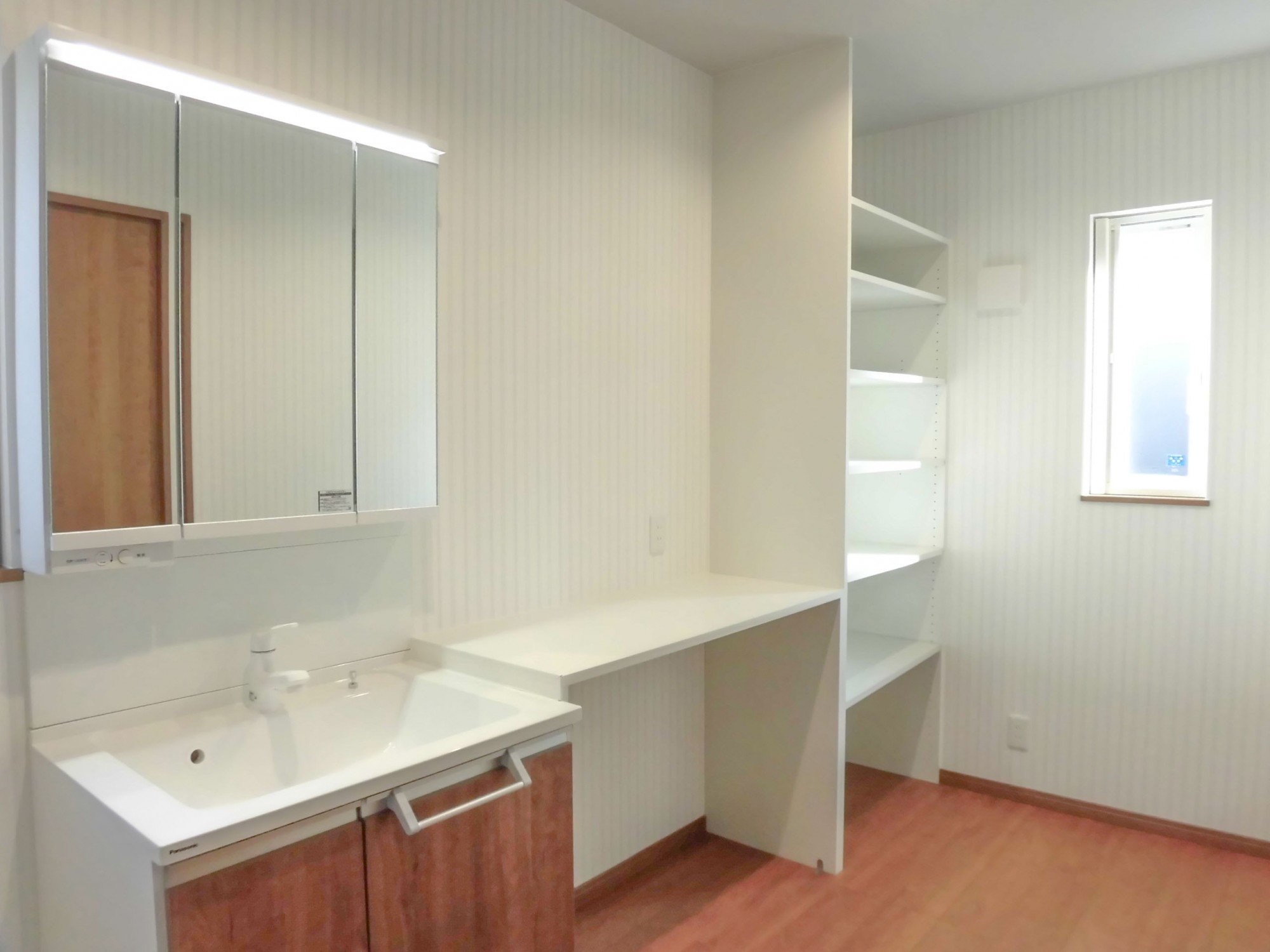 洗面所にも造作棚を配置し洗濯物をすぐに片付けられる動線を確保。