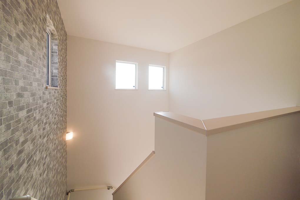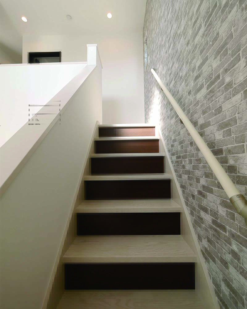 白をベースに蹴込み板のダークブラウンがおしゃれな階段です。