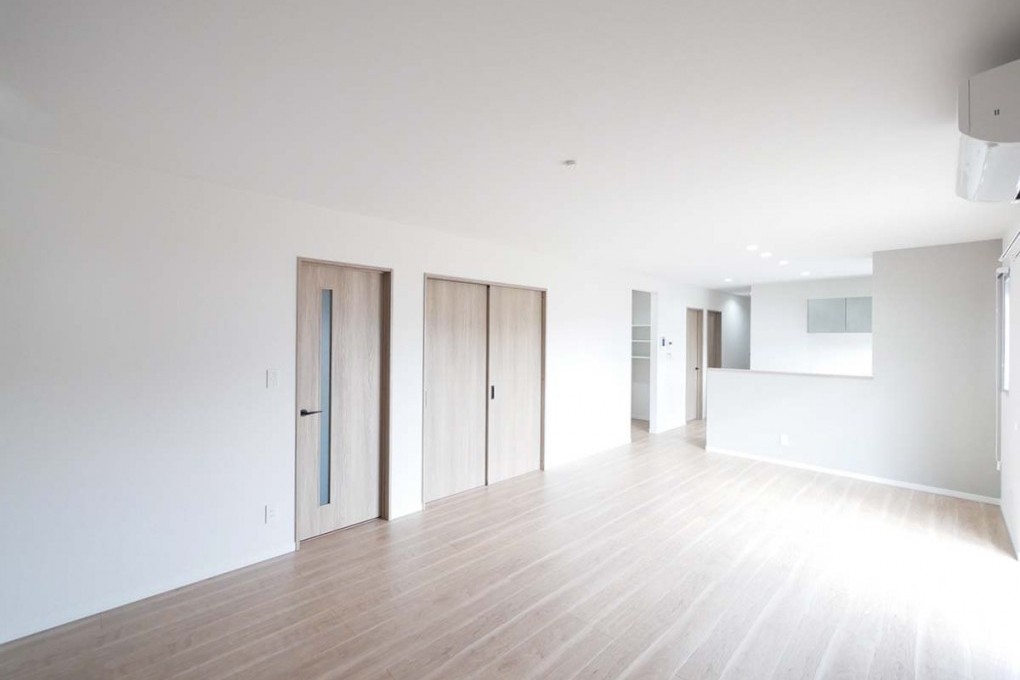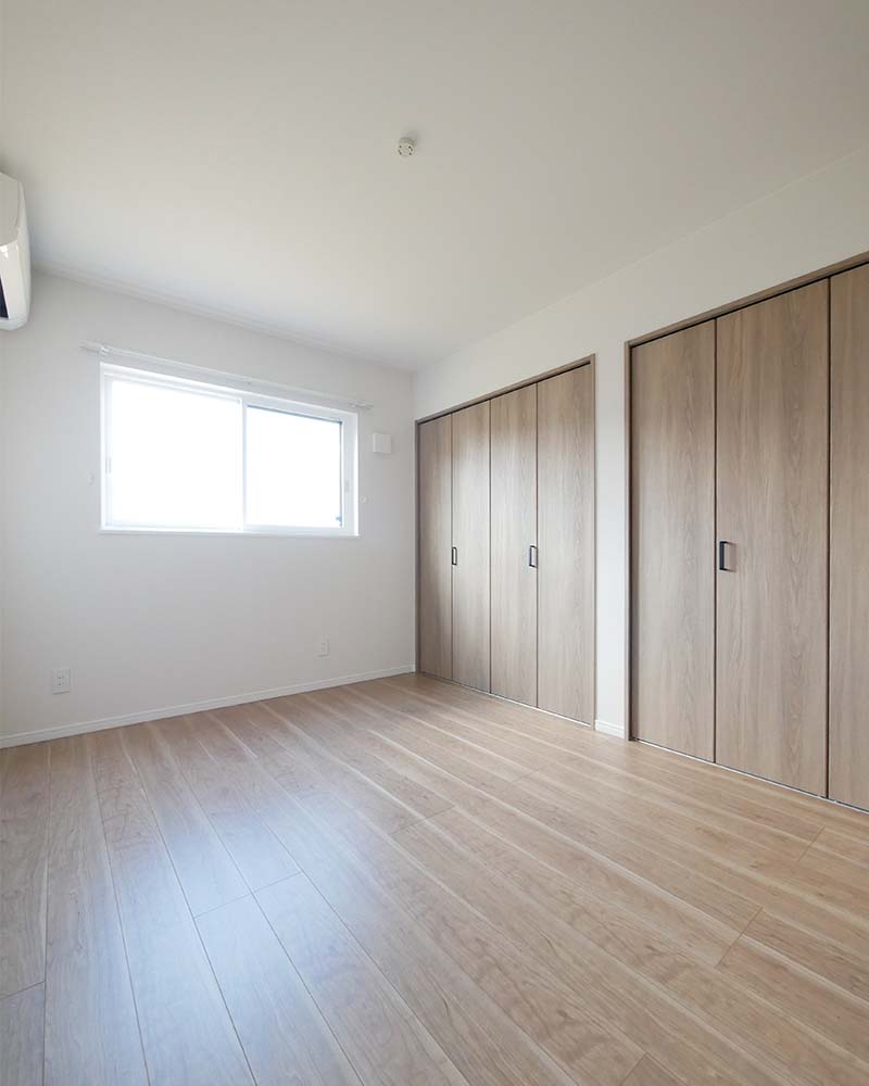 シンプルで落ち着いた雰囲気の洋室が、快適な暮らしを叶えてくれる。木目調のクローゼット扉とフローリングが温かみを感じさせ、白い壁とのコントラストがすっきりとした印象を与える。