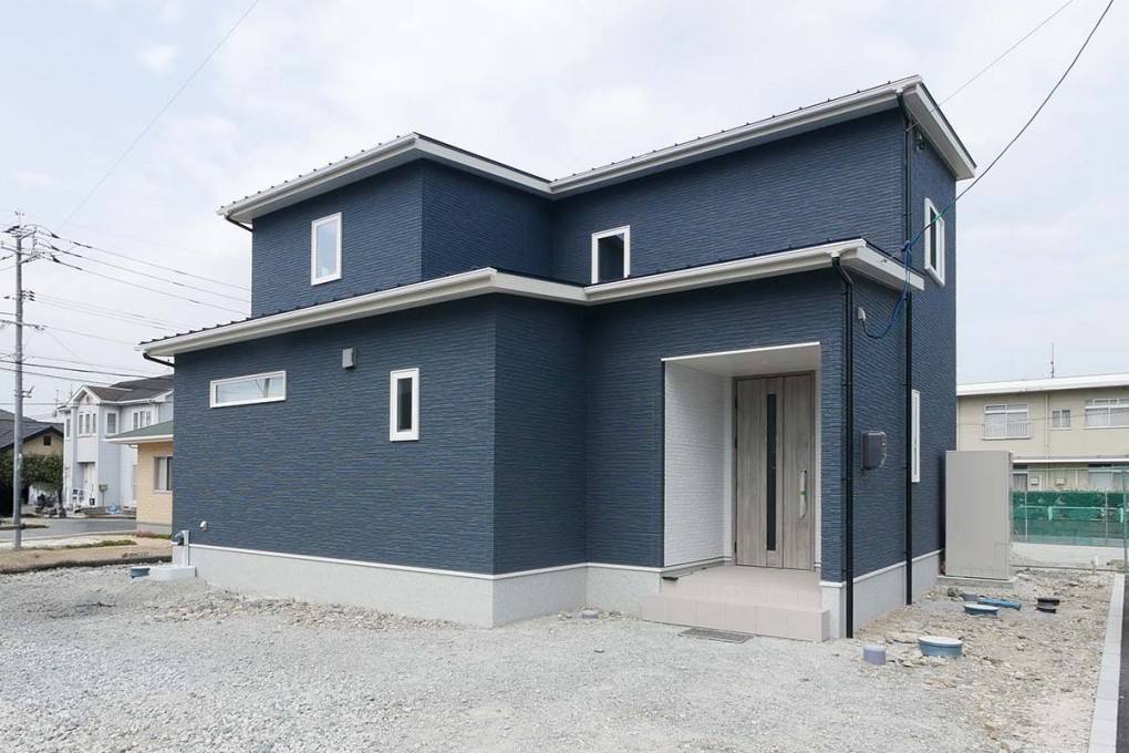 ホワイトとネイビーのツートンが美しい、モダンな印象の玄関アプローチです。屋根付きの広々としたポーチは、雨の日でも安心して出入りができます。