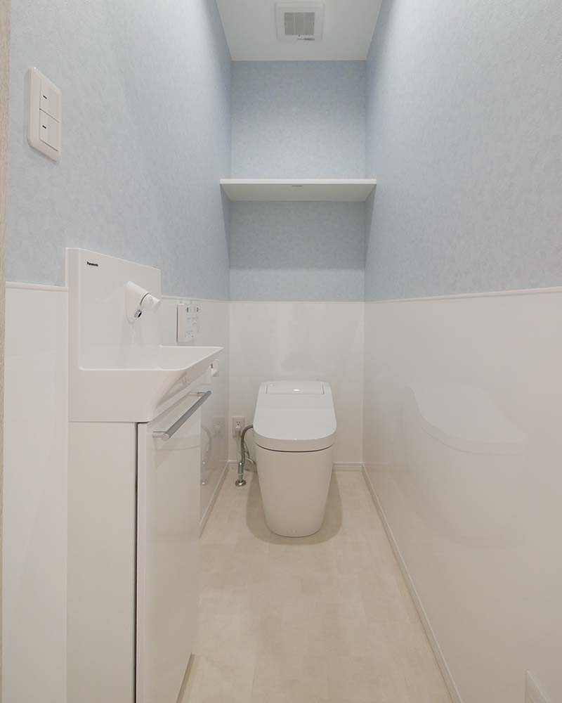 淡いブルーとホワイトで統一された、明るく清潔感のあるトイレスペースです。奥行きのある設計と収納棚付きで、使いやすさにも配慮されています。