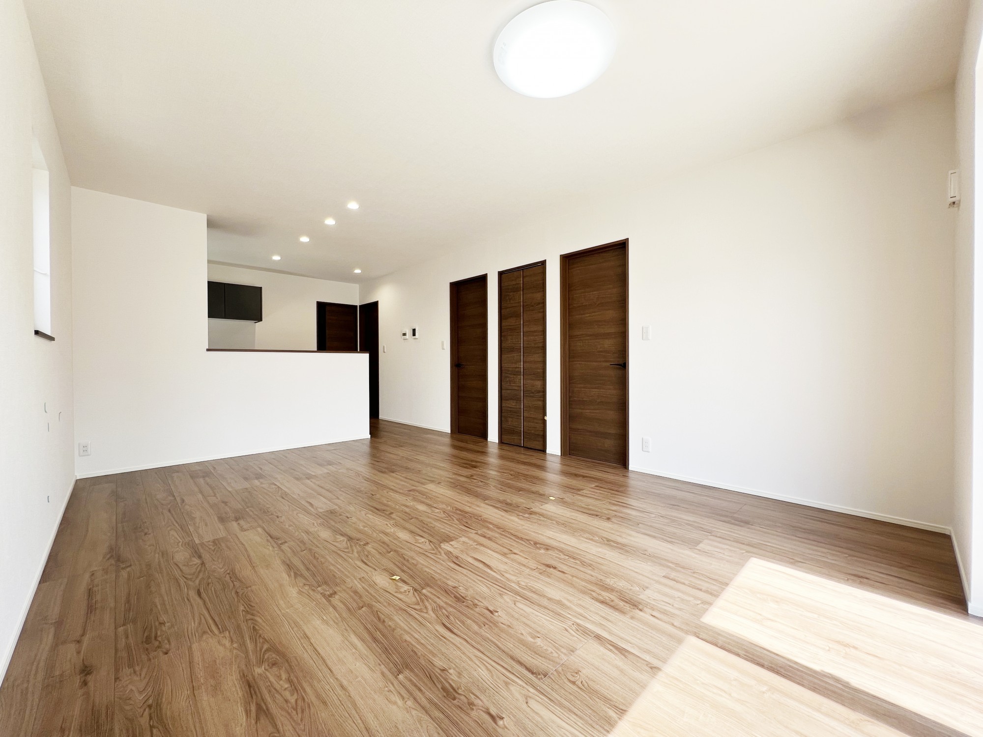16帖のLDKを中心に、主寝室と2つの洋室をバランスよく配置した3LDKの平屋。玄関から一直線につながる水まわりや、各部屋にしっかりと設けられた収納など、日常の暮らしやすさに配慮された設計です。家族との距離感を大切にしながらも、プライベート空間もしっかり確保。シンプルかつ機能的な住まいです。