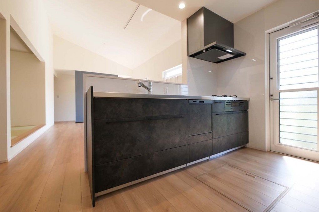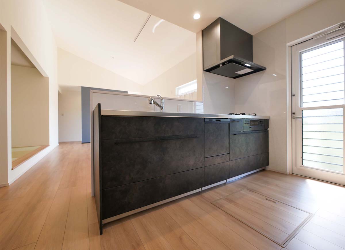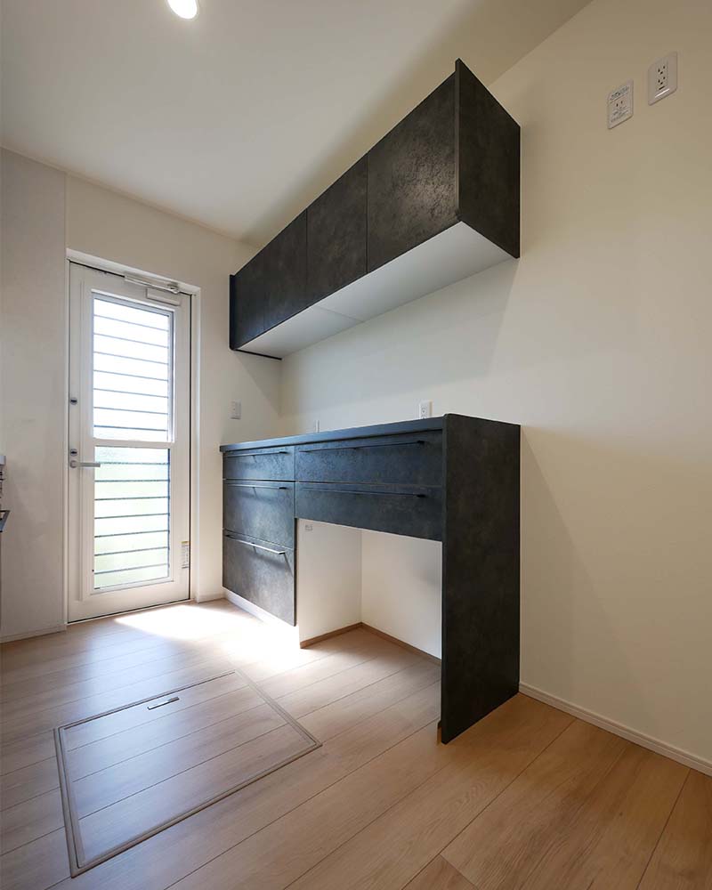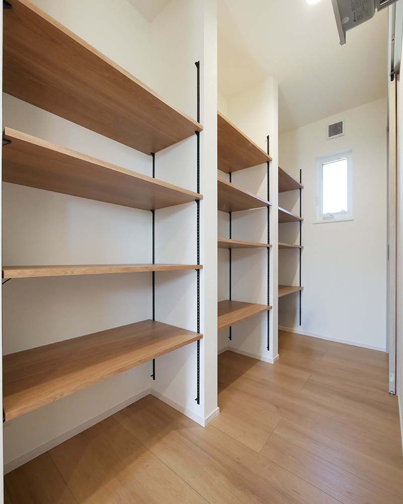 キッチン横に設けた大容量の可動棚収納。食材や日用品をすっきりと整理でき、家事動線をスムーズに保ちます。