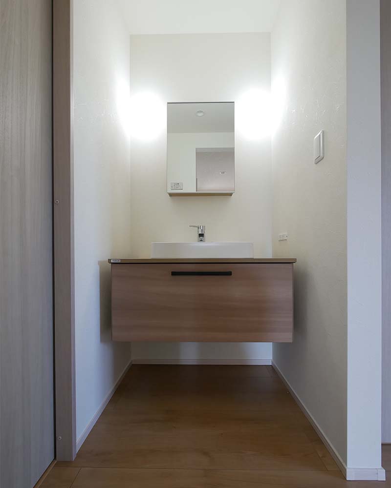 木目のキャビネットと白い洗面ボウルが調和した、シンプルで上質な洗面スペース。