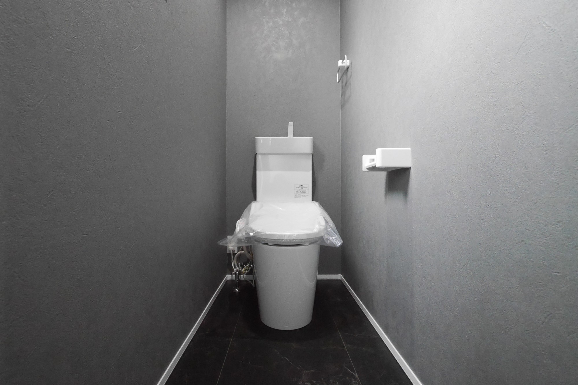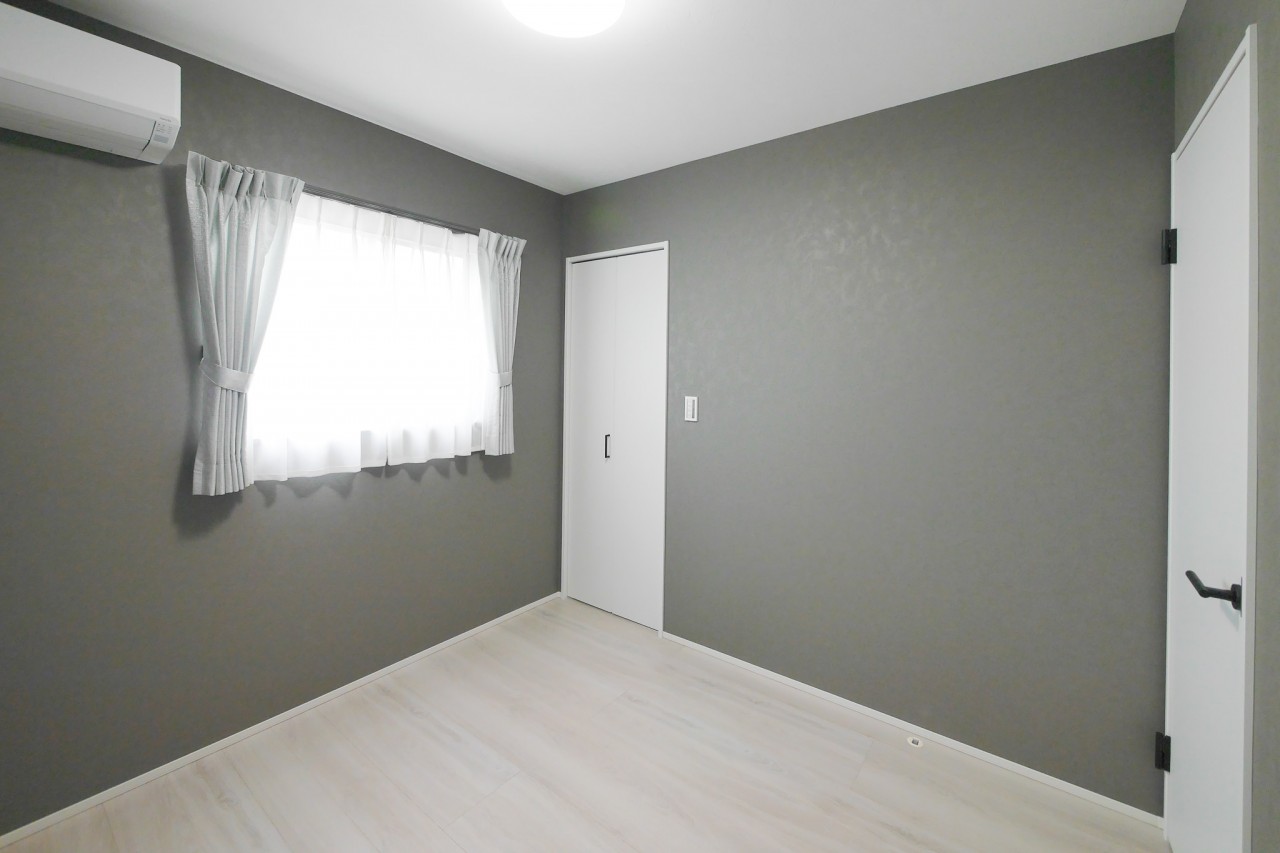 グレートーンのアクセントウォールが印象的な洋室。