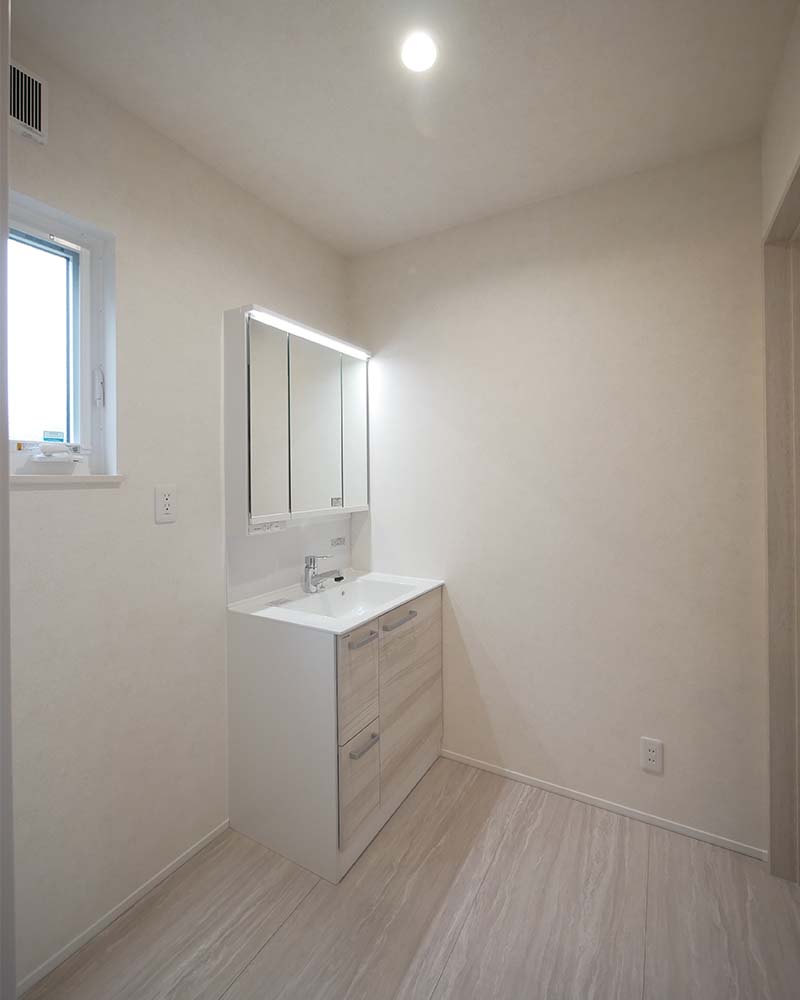 明るい脱衣スペース。毎日の身支度が気持ちよくできる、清潔感あふれる空間です。