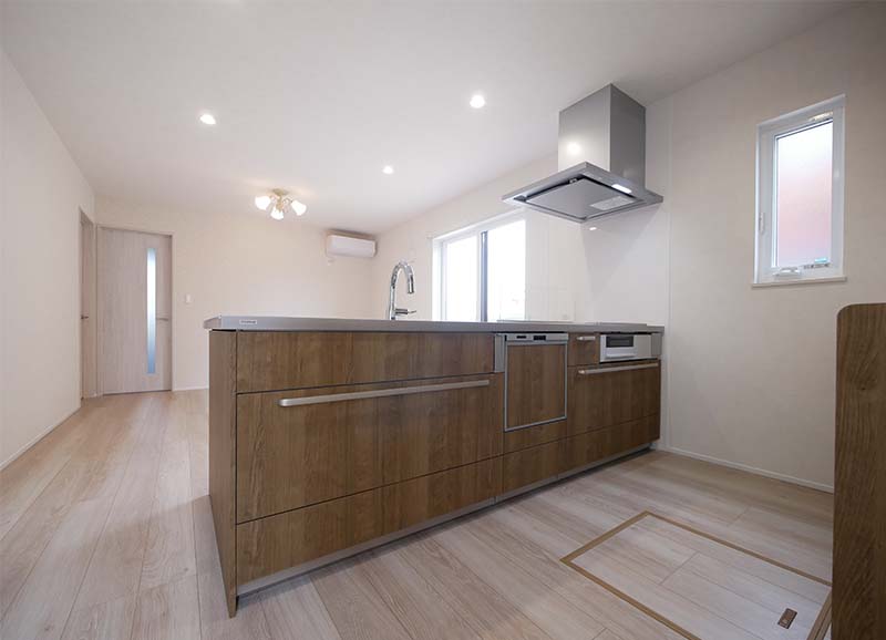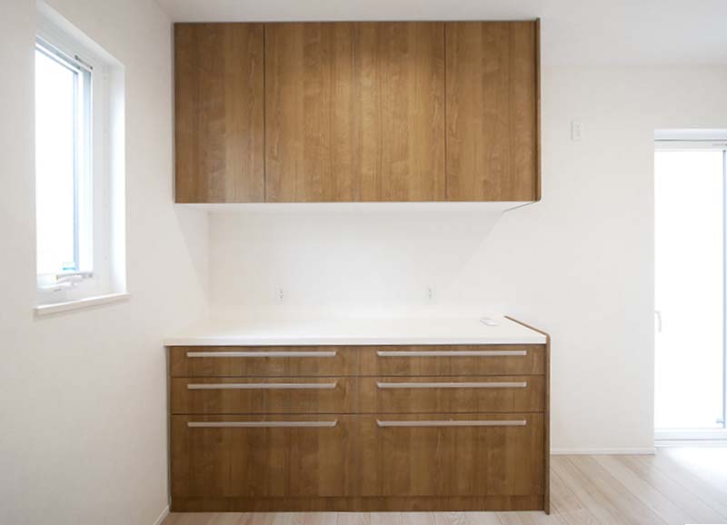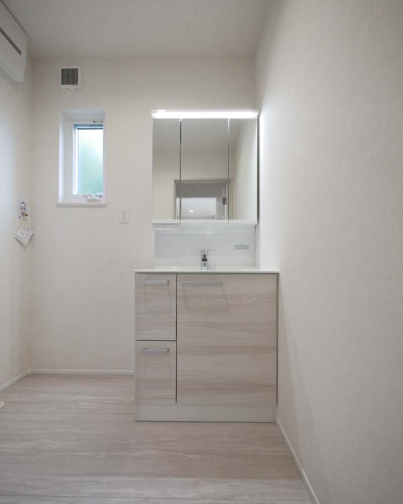 明るく清潔感のある洗面スペース。やさしい木目の扉が、空間に温かみを添えます。