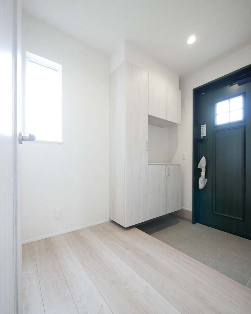 ナチュラルな色合いでまとめた、清潔感のある玄関。シンプルながらも温かみを感じる、心安らぐ空間です。