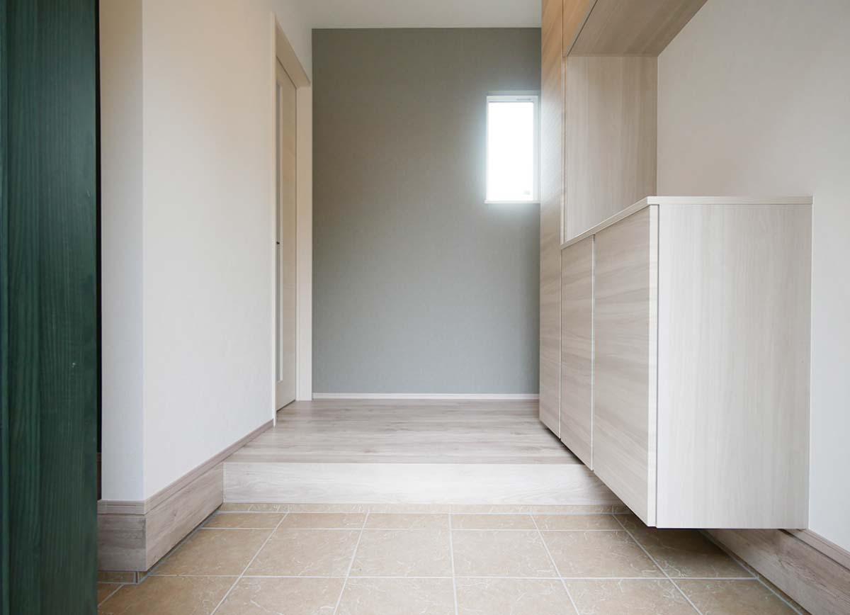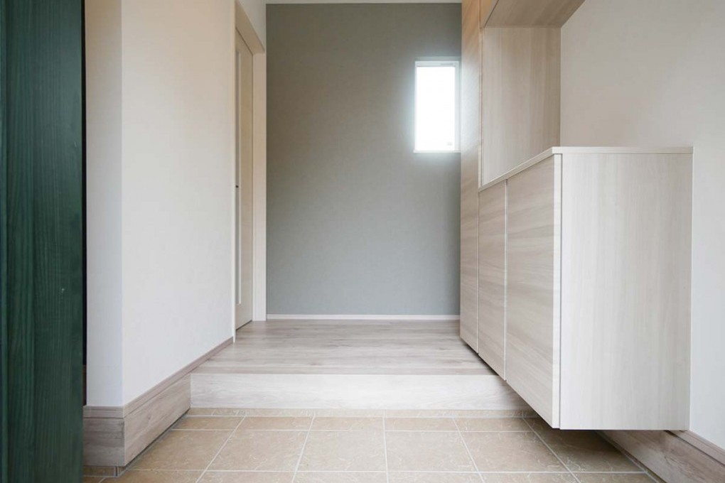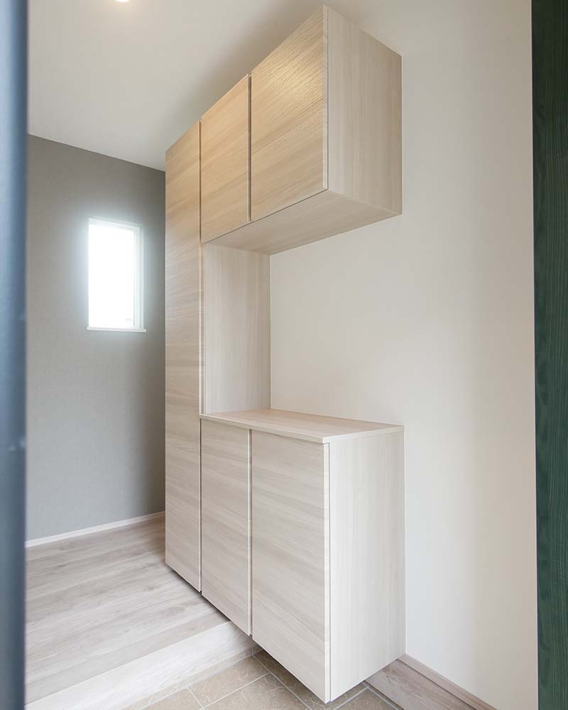 淡い木目がやさしい印象を与える、ナチュラルなシューズボックス。玄関をすっきり見せる、収納力とデザイン性を兼ね備えています。