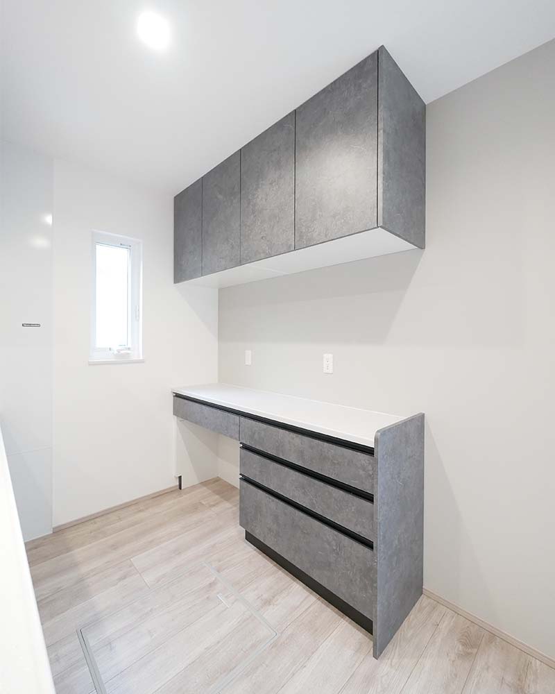 グレーの質感が美しい、スタイリッシュなカップボード。収納力とデザイン性を兼ね備えています。