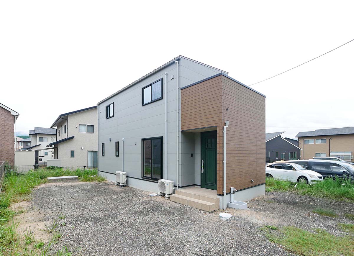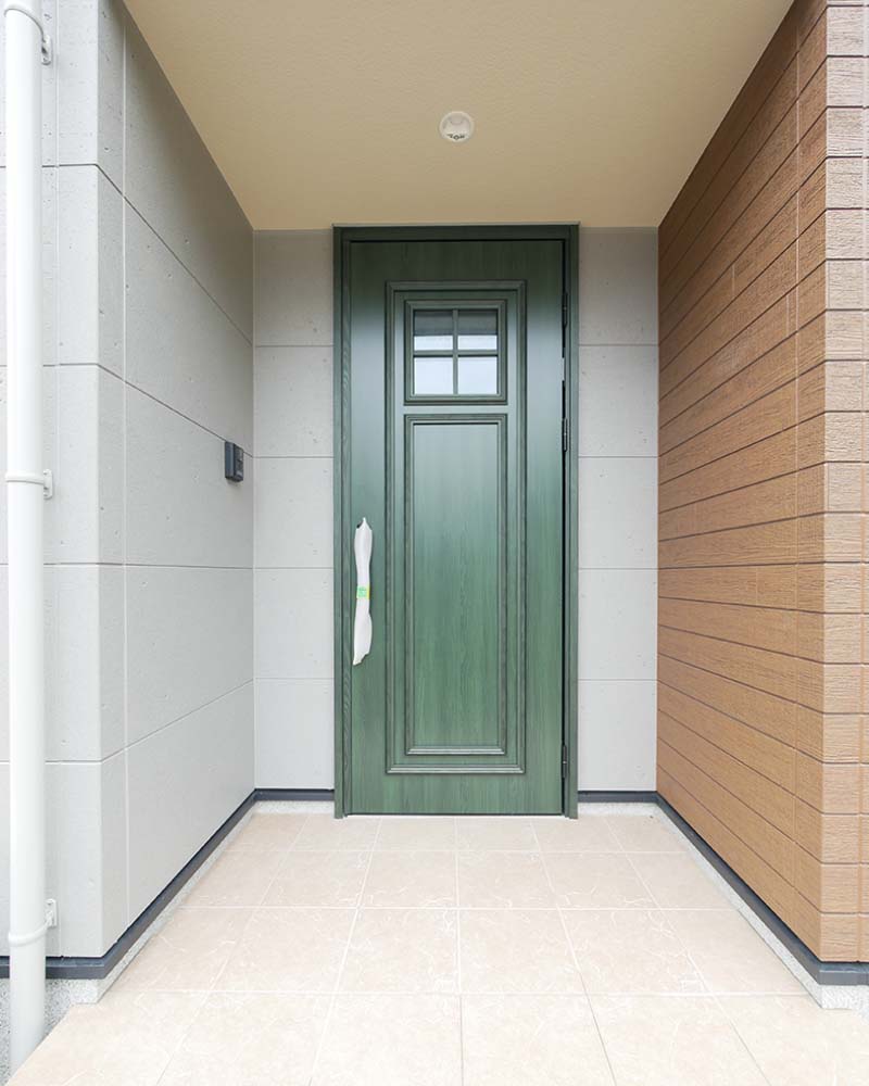 深みのあるグリーンが印象的な玄関ドア。落ち着いた色合いが外観全体を上品に引き立てます。