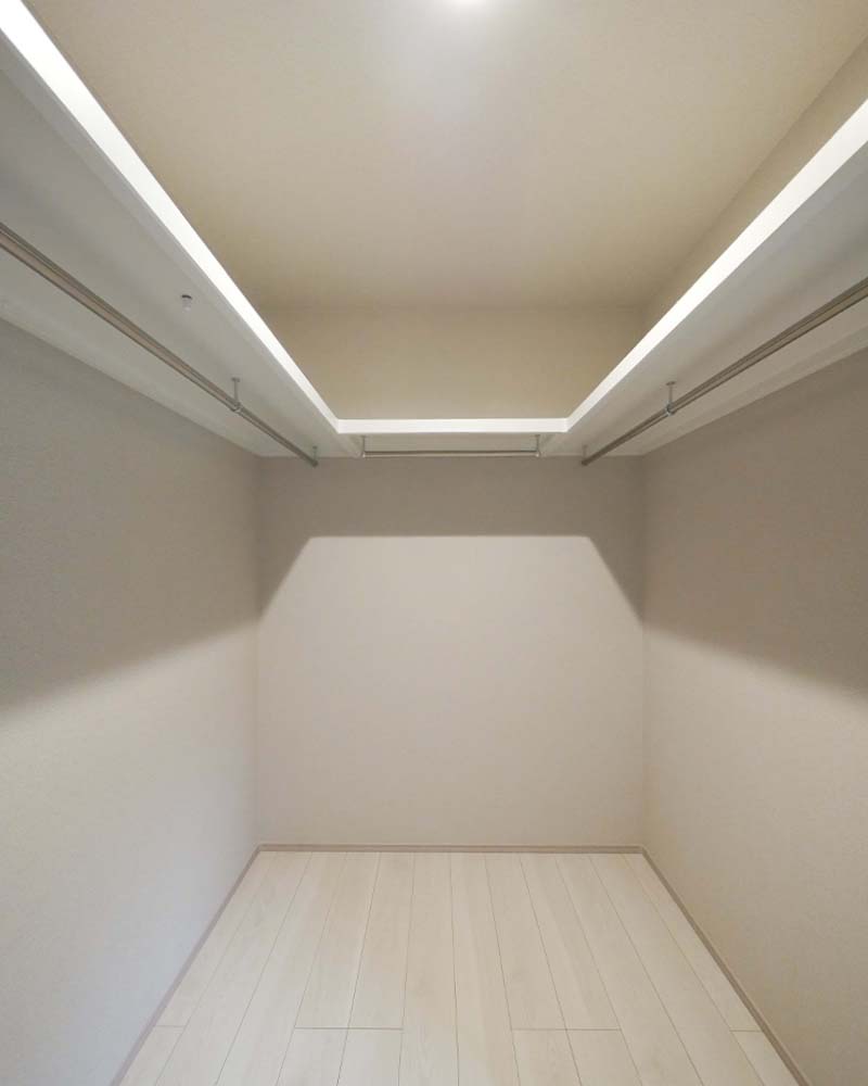 両サイドにハンガーパイプを備えた、使い勝手の良いウォークインクローゼット。衣類や小物をすっきり収納できるます。