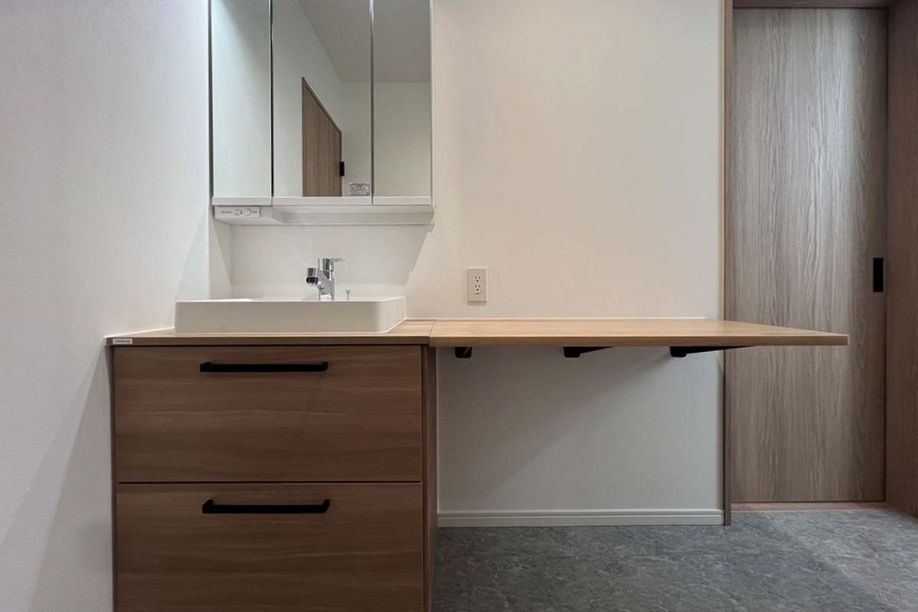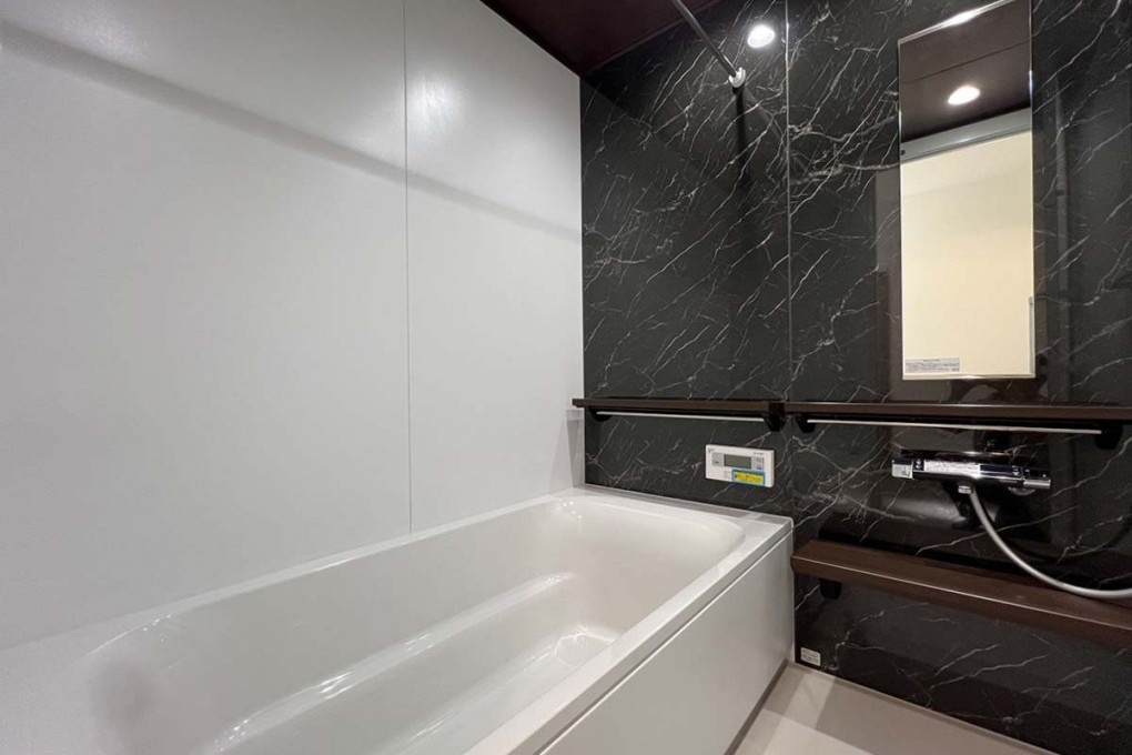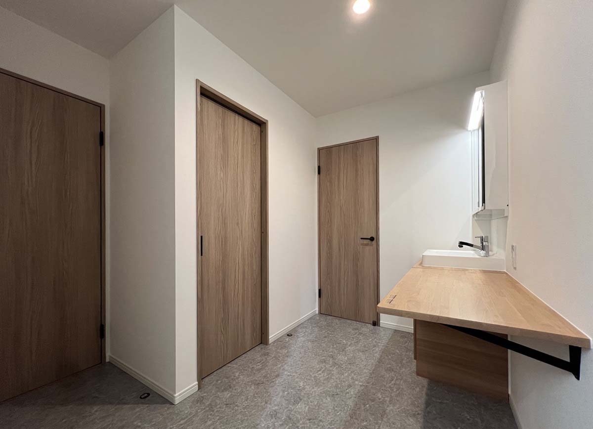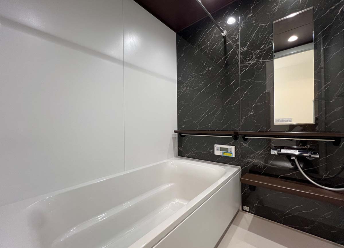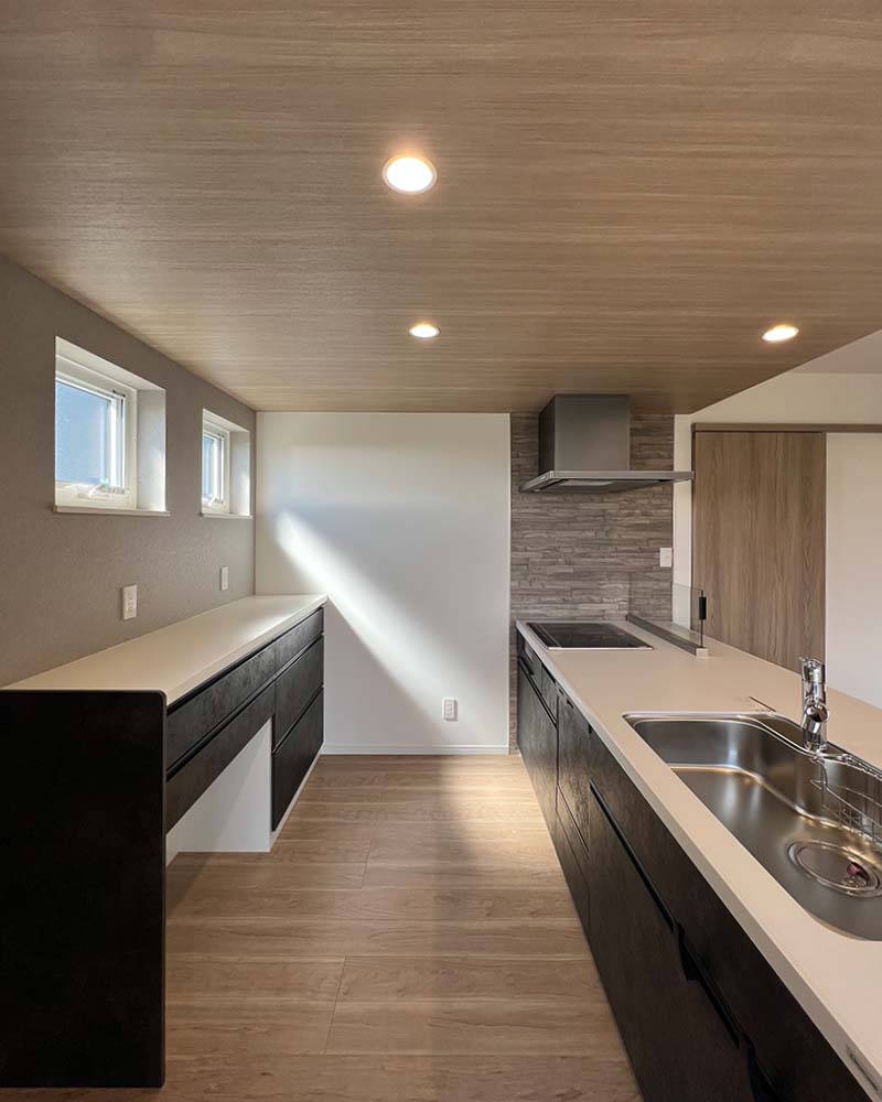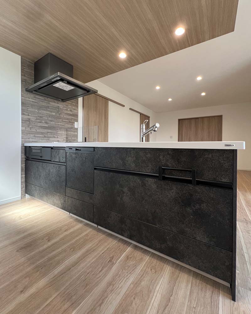 木目天井とブラックのキッチンが調和した、上質な水まわり空間。落ち着いたトーンの中に、使いやすさとデザイン性を兼ね備えています。