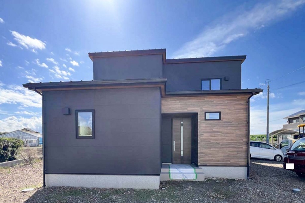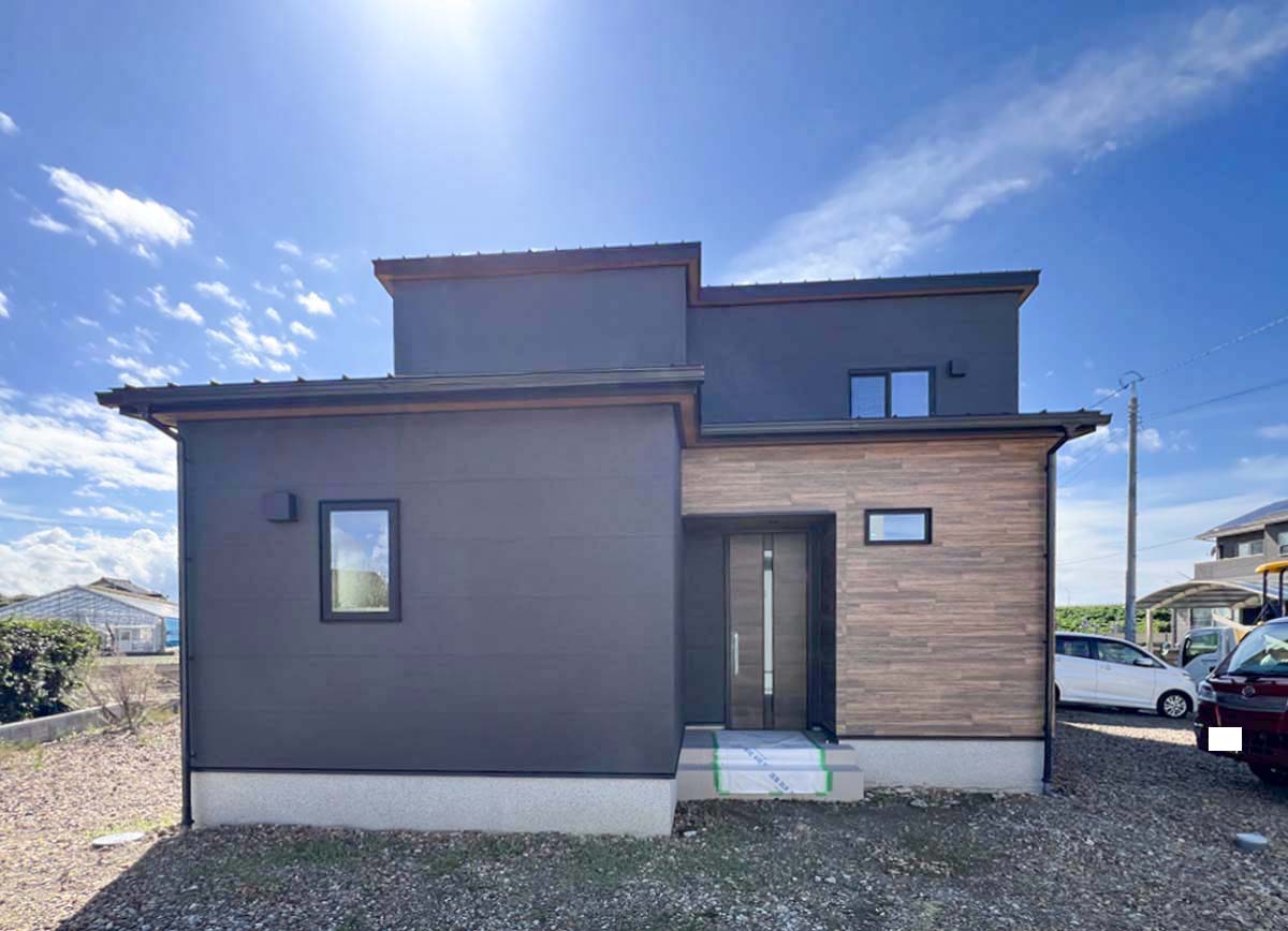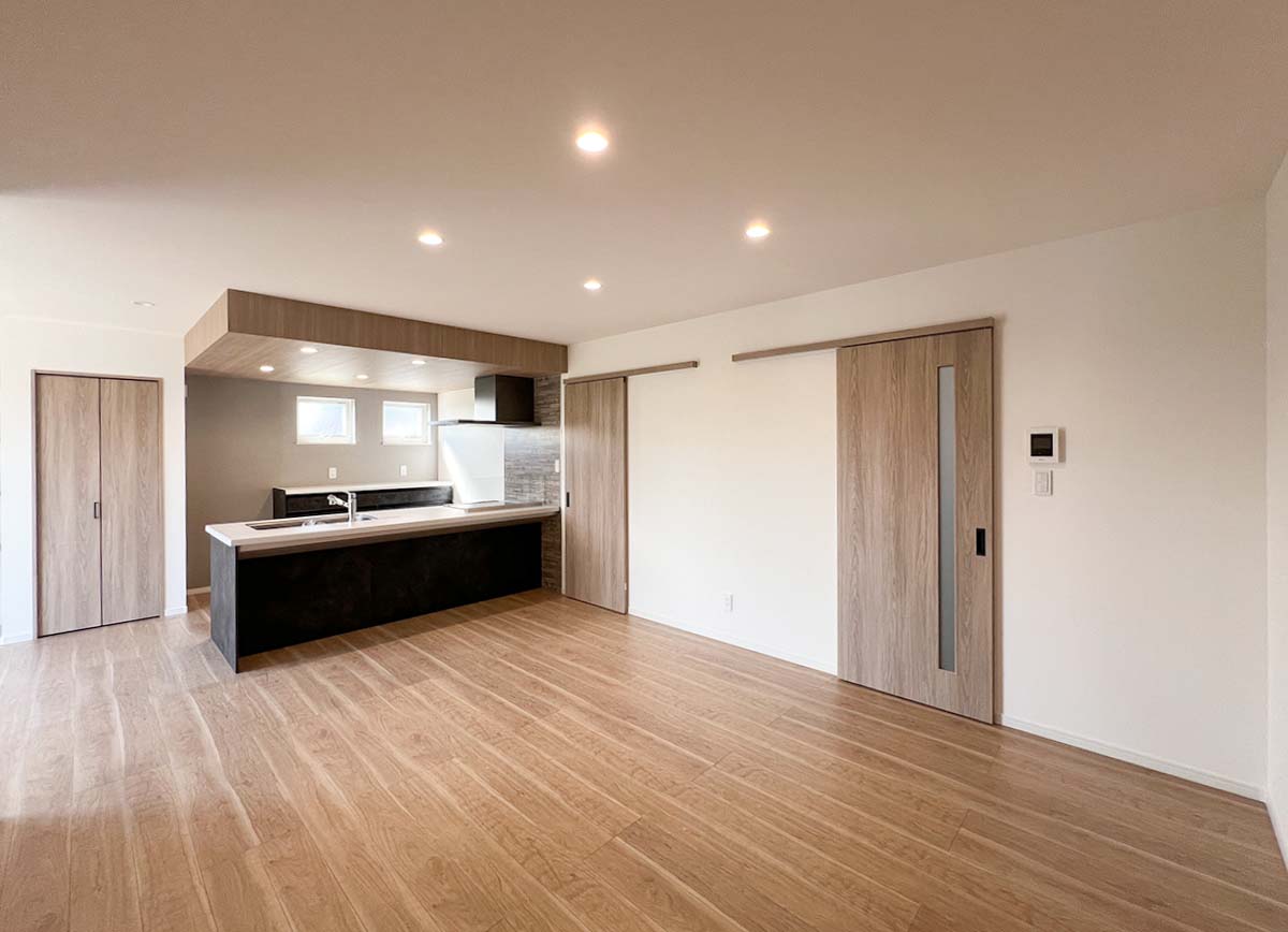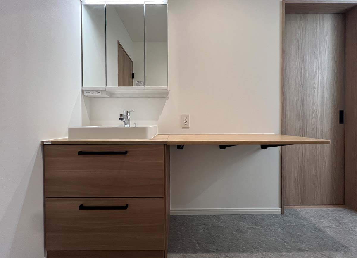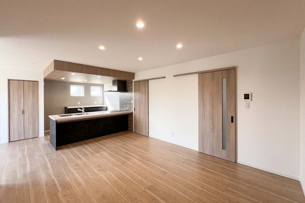 木目天井とブラックのキッチンが調和した、上質な水まわり空間。落ち着いたトーンの中に、使いやすさとデザイン性を兼ね備えています。