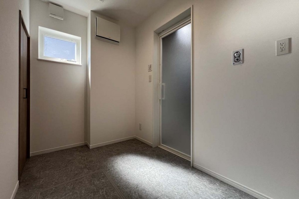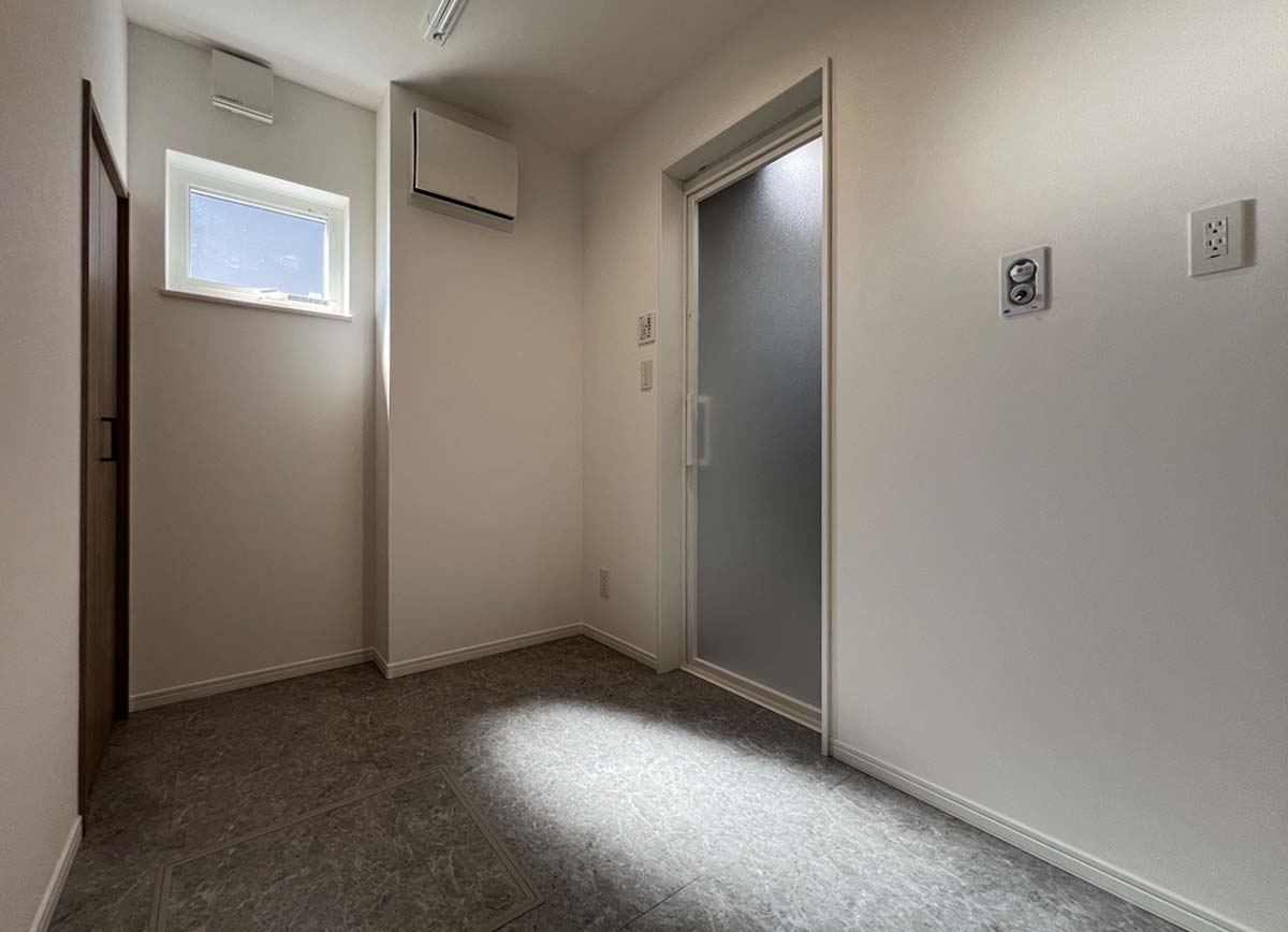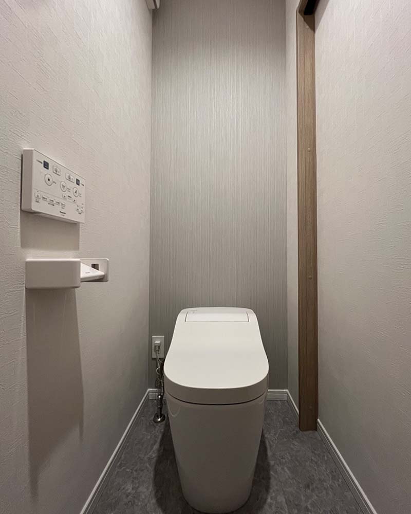 グレートーンで統一された、落ち着いた印象のトイレ空間。シンプルながらも洗練されたデザインが、清潔感を引き立てます。