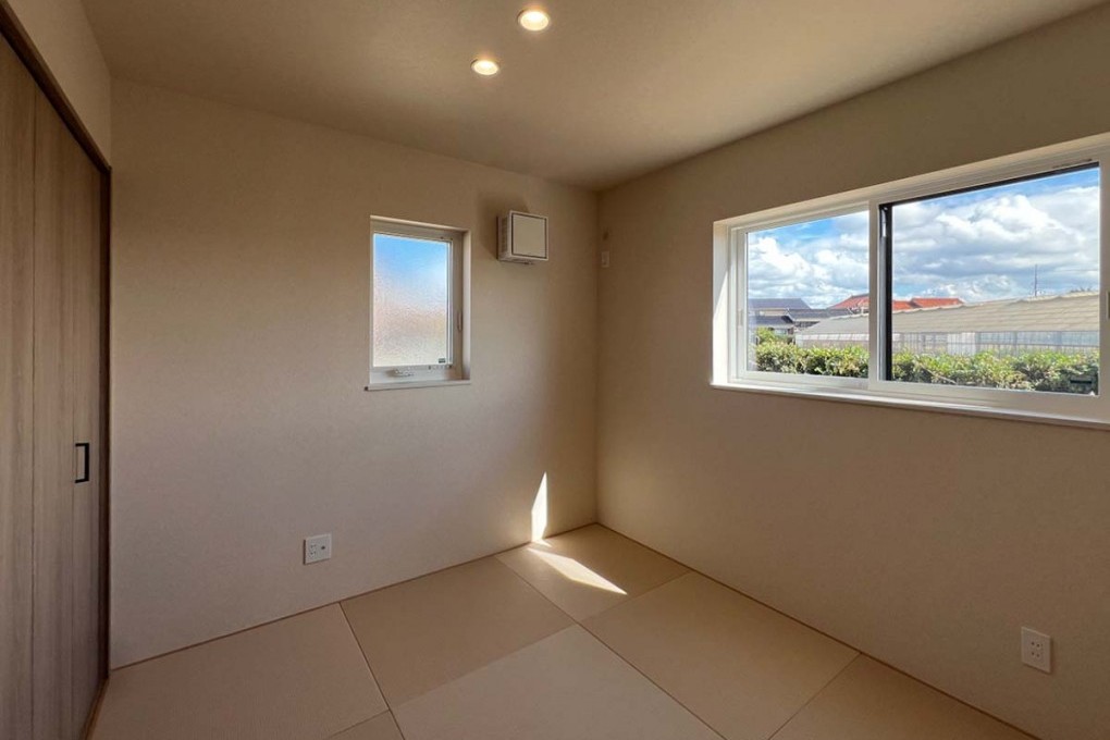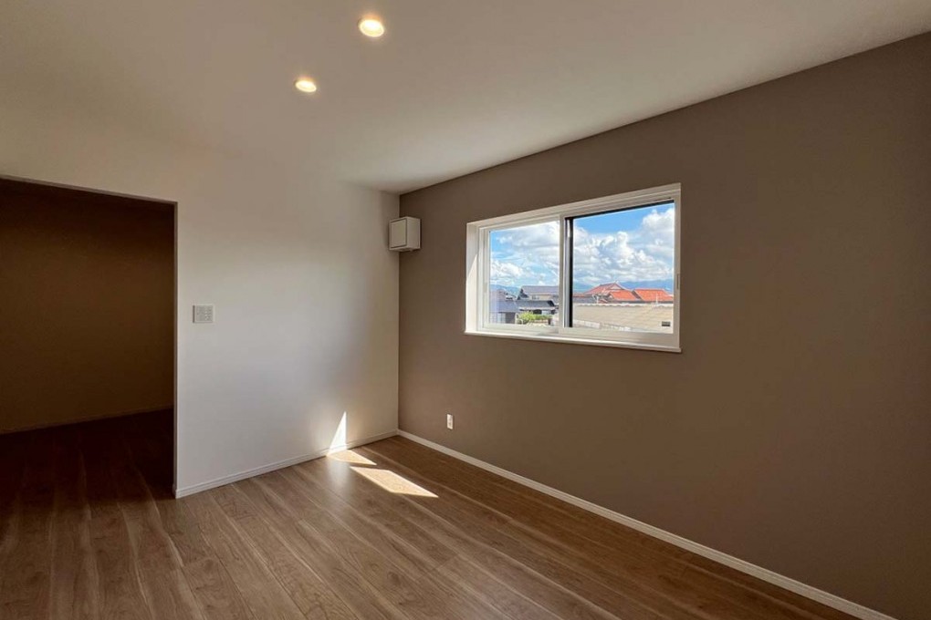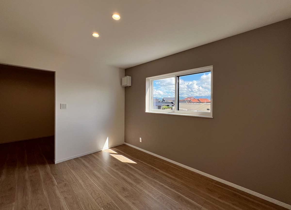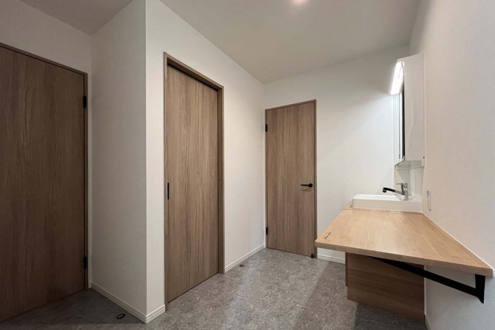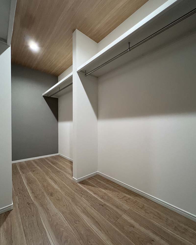 天井の木目とグレーのアクセントが心地よいウォークインクローゼット。ゆとりある空間で、衣類や小物をすっきりと収納できます。